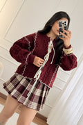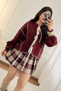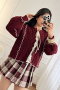 Cardigan em tricot com tranças e detalhes contrastantes nas costuras. Fechamento com laços frontais, modelagem soltinha e confortável