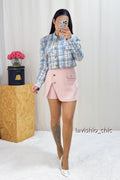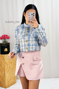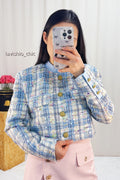 Jaqueta curta de tricot com gola alta, no estilo tweed de mistura de cores, da coleção de primavera/verão 2025 da alta-costura, com botões metálicos delicados no fecho, trazendo um toque sofisticado e elegante ao visual.