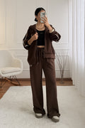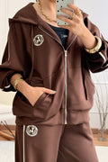 O casaco conta com fecho de correr frontal, capuz ajustável com cordões e bolso canguru. As mangas apresentam fita lateral de inspiração desportiva e o logótipo bordado no peito reforça a identidade da peça.