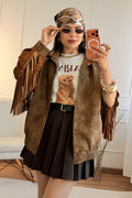 Casaco em estilo western com franjas laterais e aplicação estampada nas costas, que dá um toque criativo e descontraído.