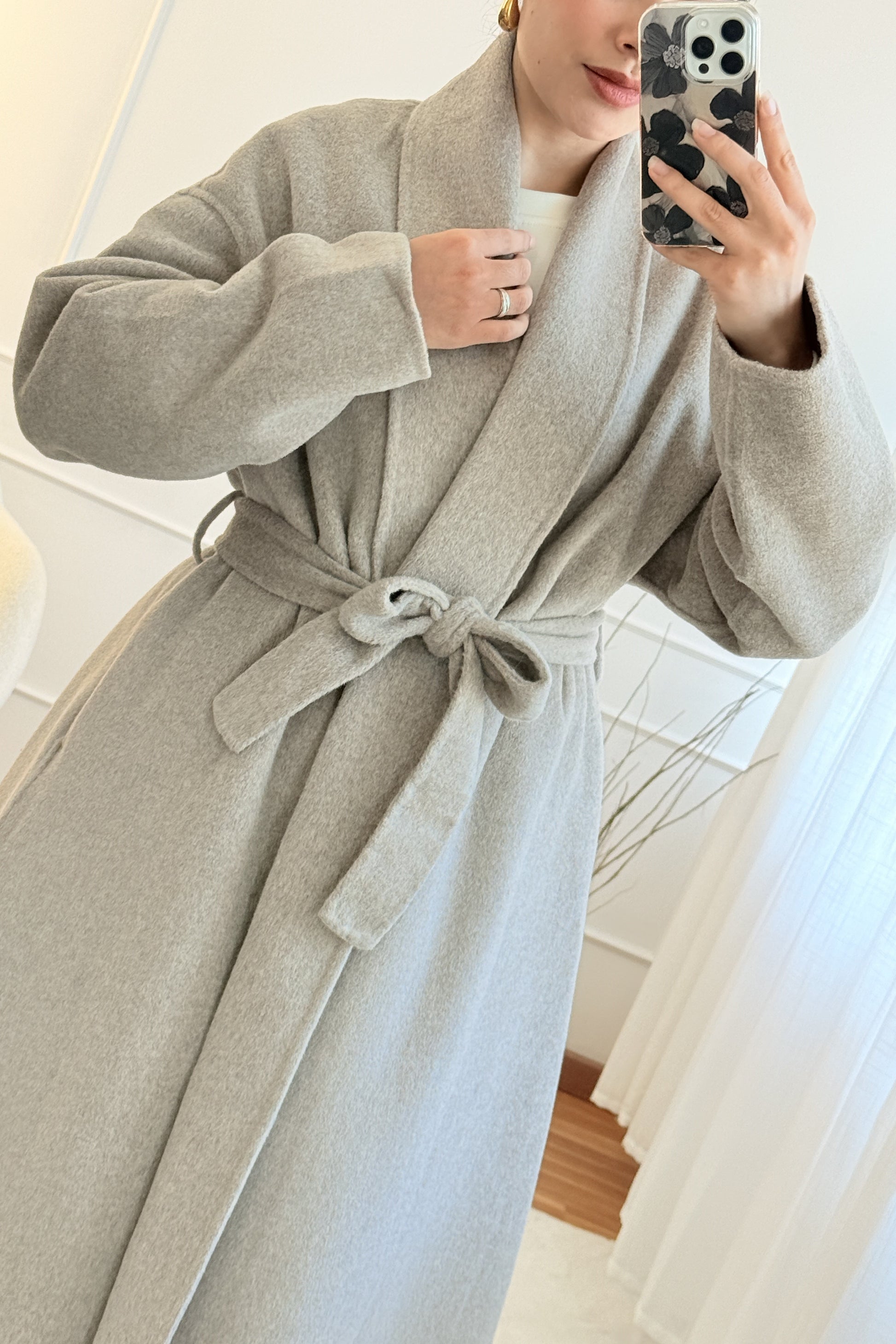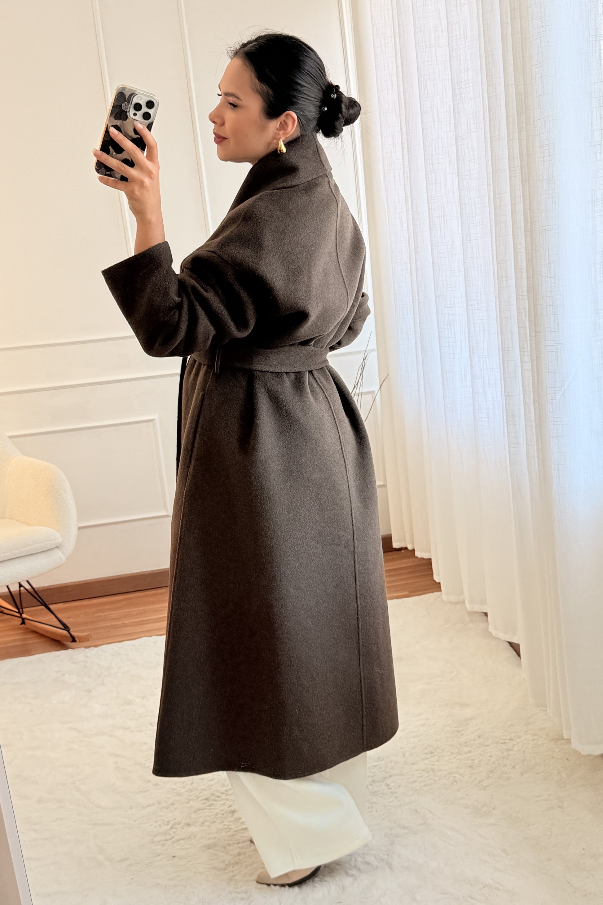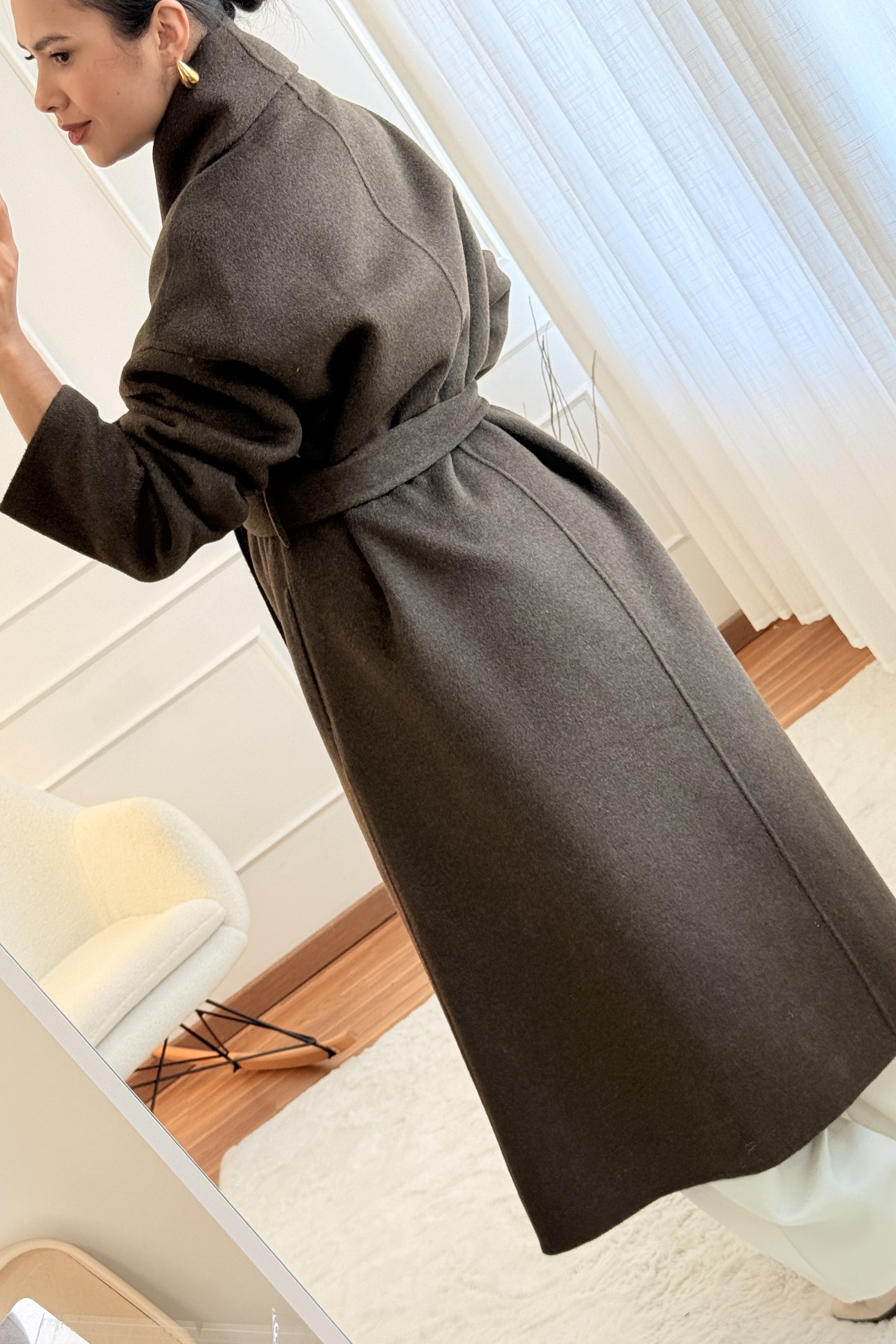 Casaco comprido em lã misturada, design clássico e elegante com cinto ajustável na cintura. Corte confortável e versátil, ideal para dias frios.