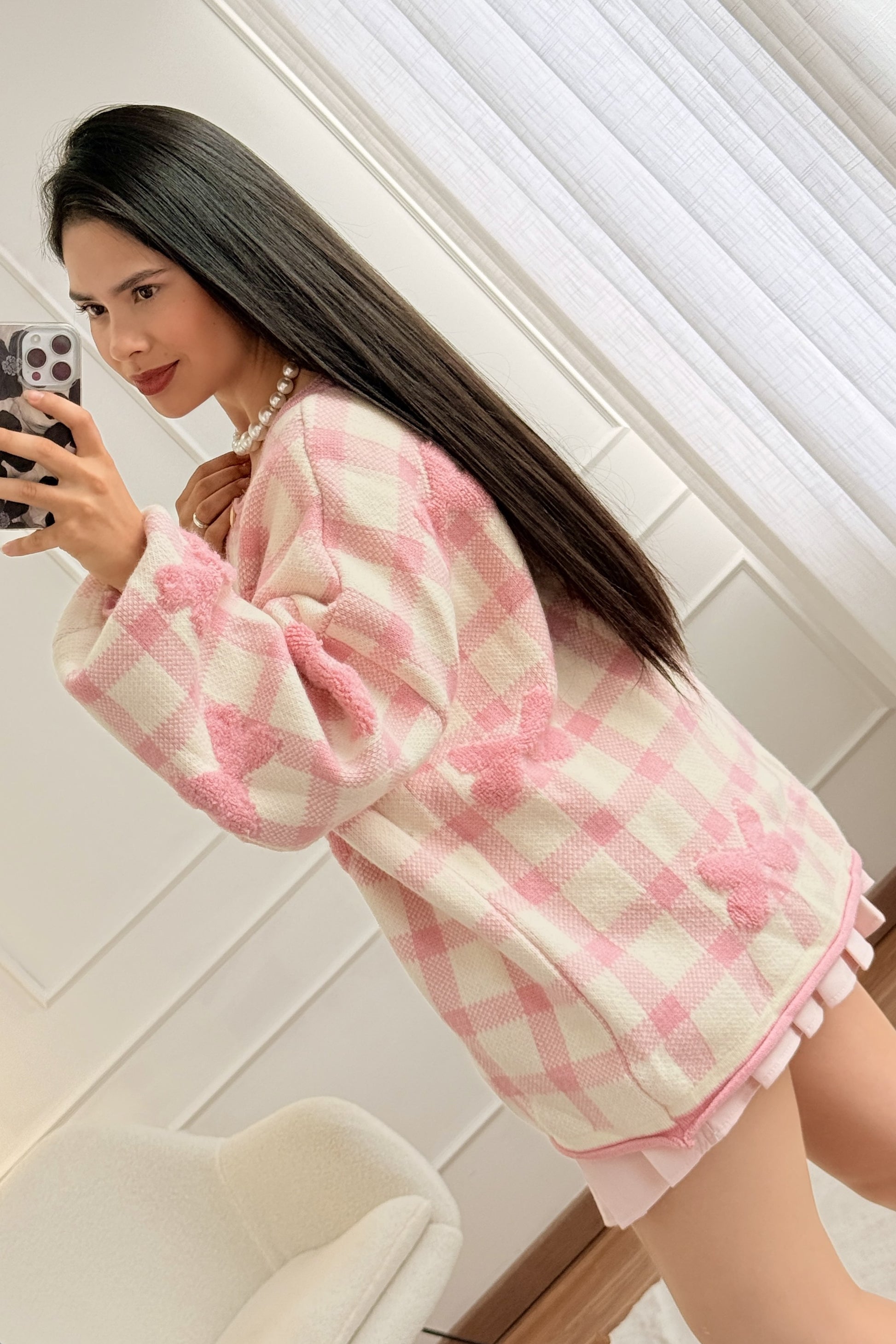 Casaco rosa de malha às riscas com laços super fofinhos.