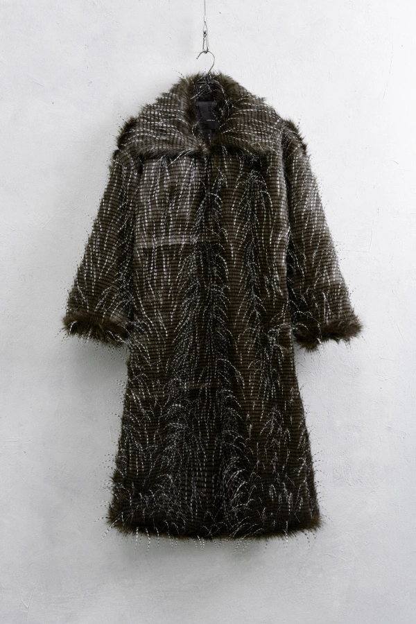 Casaco confeccionado em pêlo sintético, com colarinho de lapela. Fecho frontal com botões, bolsos laterais e interior forrado. Corte regular, disponível em tamanho único.