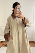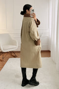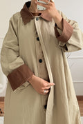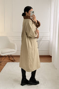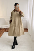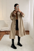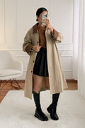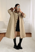 Trench coat oversize com gola de lapela e fecho frontal com botões ocultos. Apresenta bolsos frontais com aba e detalhes contrastantes na gola e na bainha das mangas. Conta ainda com pence na parte de trás, cinto ajustável e botão para melhor ajuste. Disponível nos tamanhos S/M e M/L.