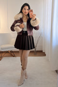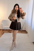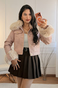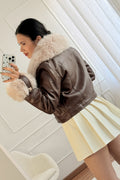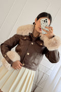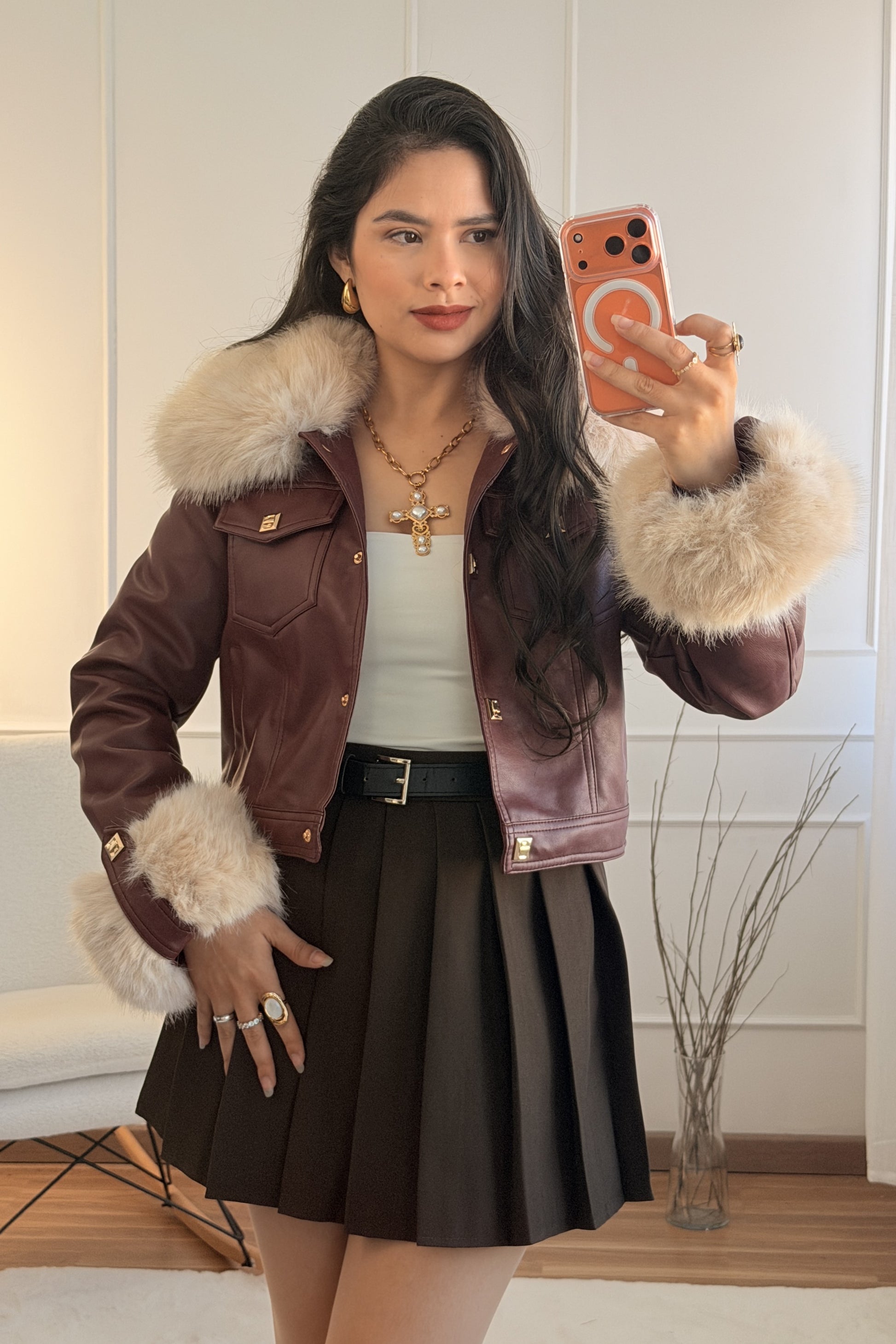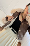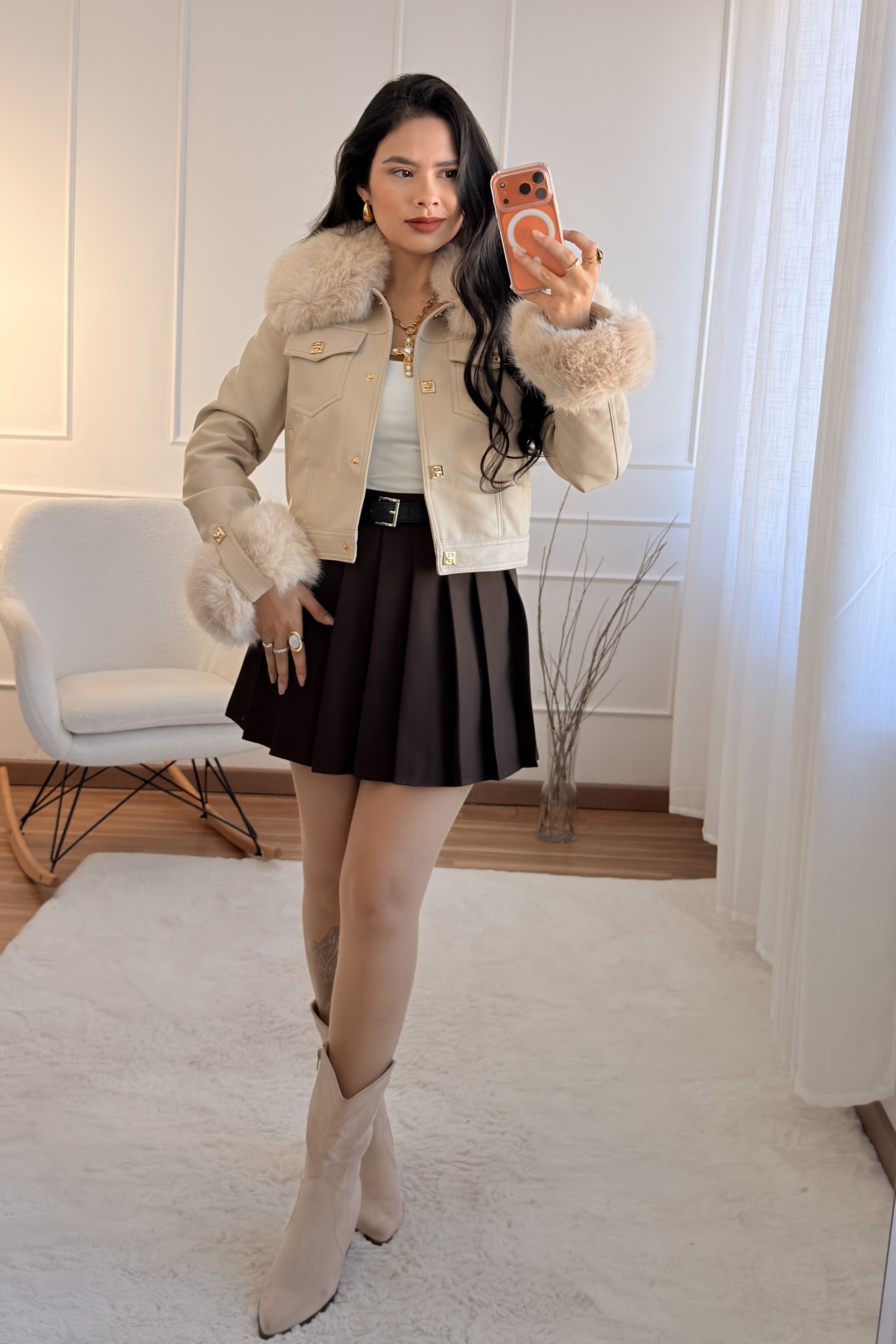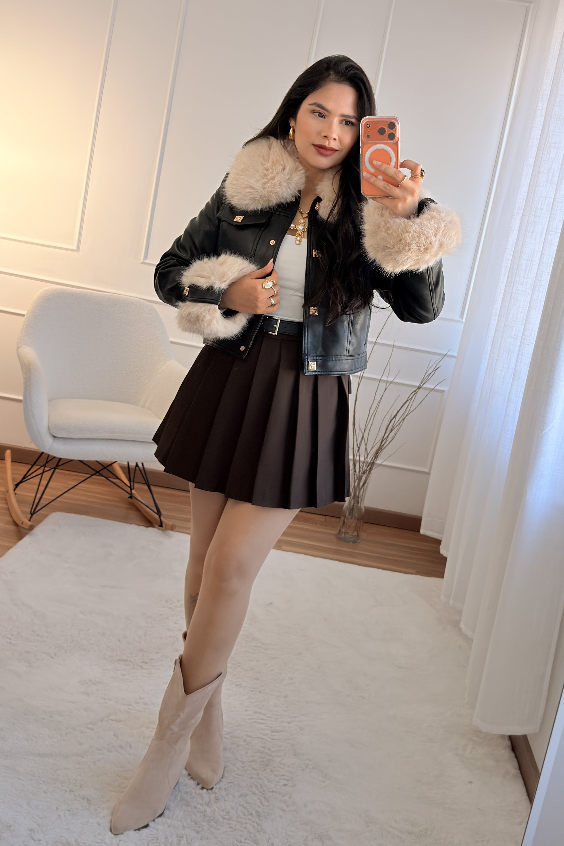 Casaco de design estruturado em napa, com gola e punhos em pelo suave removível. Interior forrado também em pelo, proporcionando conforto e aquecimento. Fecho frontal com botões metálicos e bolsos de aba na parte superior.