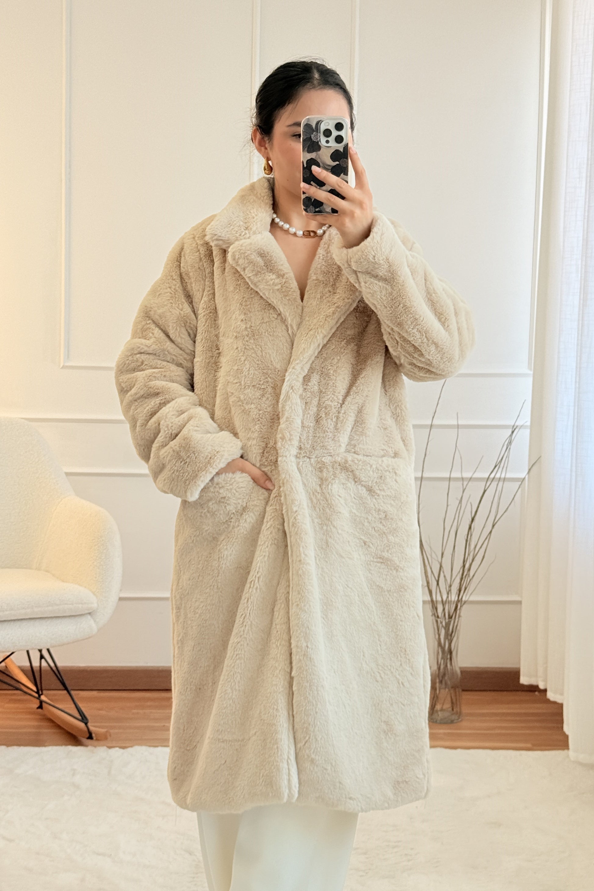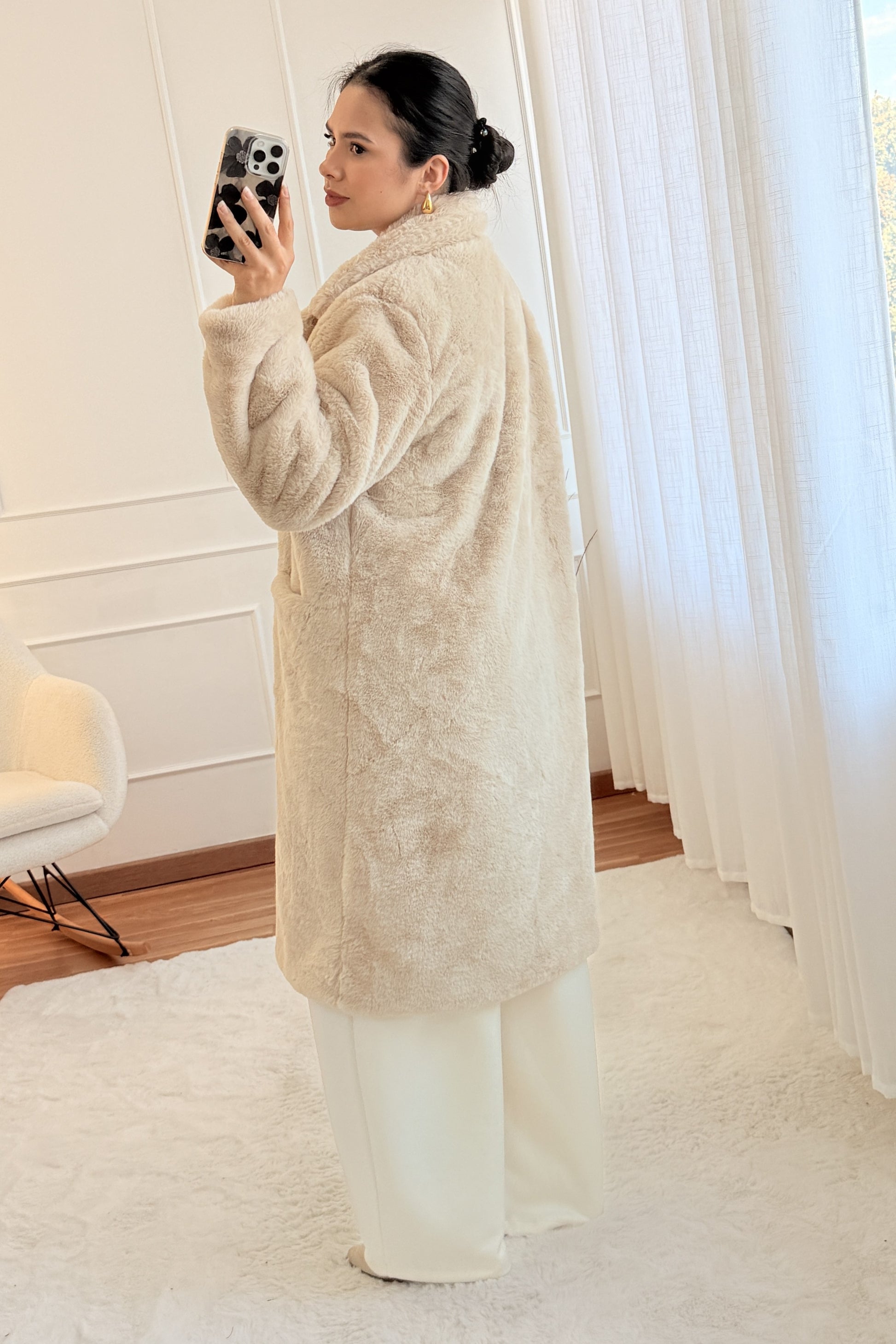 Casaco feminino comprido, confeccionado em pêlo sintético de toque extra macio, ideal para os dias frios. Modelo com colarinho de lapela, bolsos laterais funcionais e corte confortável que garante elegância e aconchego.
