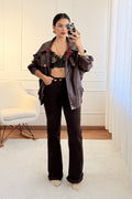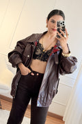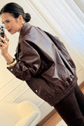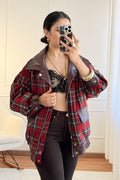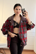 Casaco feminino reversível com design versátil: um lado em napa sintética em tom vinho para um look sofisticado e moderno, e o outro lado em tecido tartan clássico para um estilo mais casual e descontraído. Modelo oversize com fecho de correr, bolsos aplicados e acabamentos cuidados.