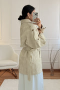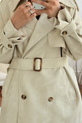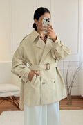Gabardine curta da marca Lumina com corte estruturado e detalhes clássicos. O tecido apresenta uma textura canelada, que remete ao aspeto da bombazina, mas mantém um acabamento impermeável e acetinado, ideal para dias de chuva. Possui cinto com fivela na cintura, que valoriza a silhueta, além de botões frontais duplos e abas nos ombros, conferindo um estilo elegante e atemporal. Veste de S a L