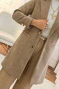 Tem lapela clássica, pormenores em dourado (botões e detalhes no bolso) e um tecido macio com padrão chevron (espinha de peixe).