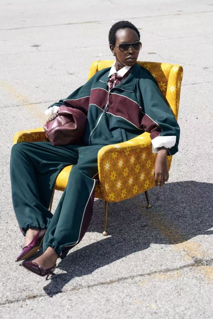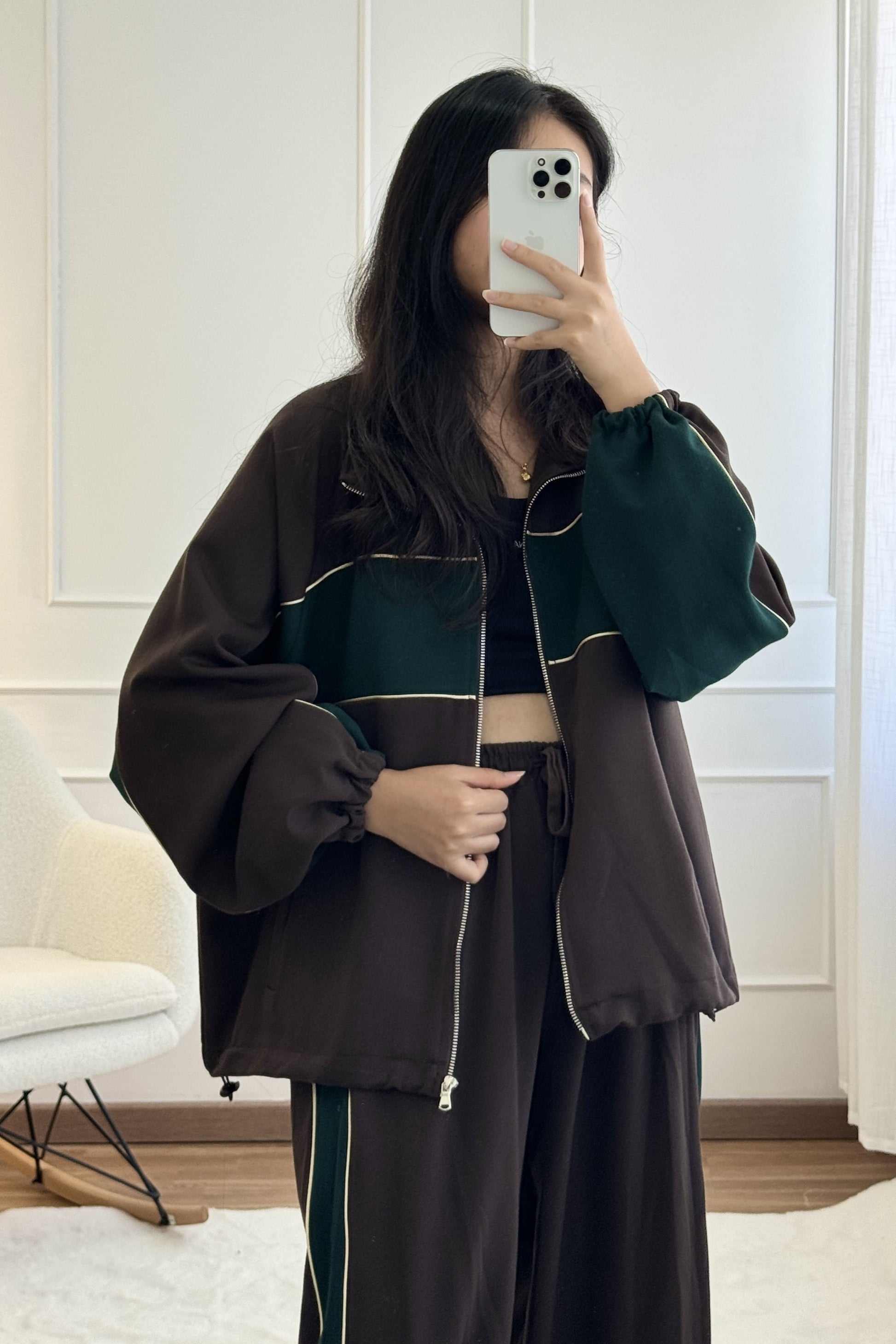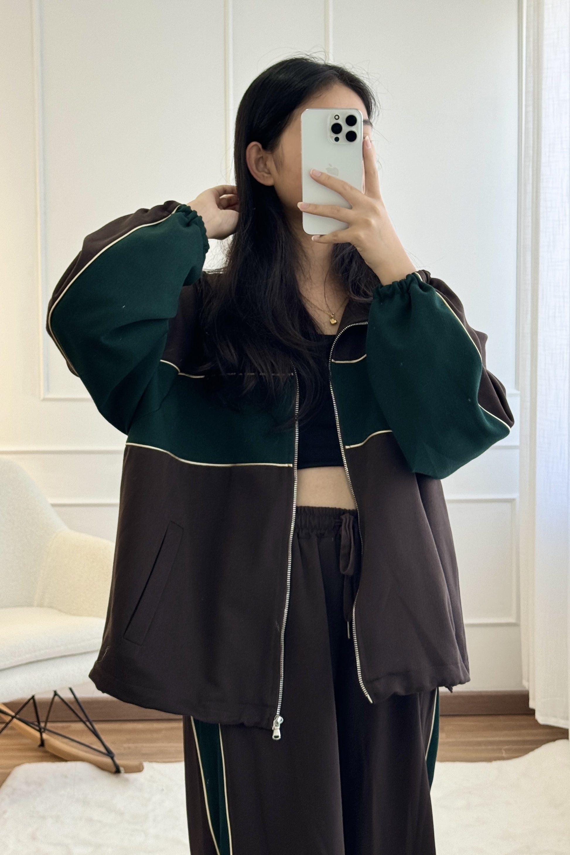 Jaqueta esportiva oversized, com zíper frontal e recortes contrastantes. Modelagem descontraída, ideal para um look urbano moderno e confortável