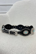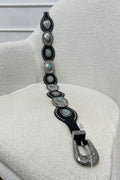 Cinto em estilo vintage com fivela trabalhada em prata e aplicações metálicas com pedras turquesa.