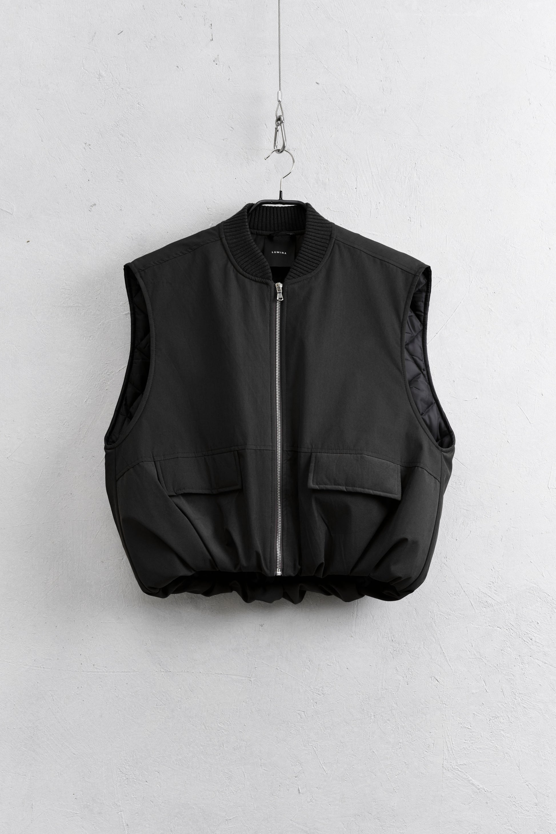 Colete acolchoado. Ligeiramente crop top. Possui bolsos frontais. Fecho frontal com fecho de correr. Corte regular, disponível em tamanho único.