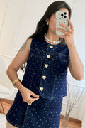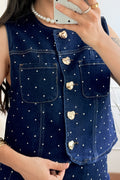 Colete sem mangas em tecido estruturado, com bolsos frontais aplicados e botões decorativos em destaque. O design moderno e versátil permite combinações elegantes ou casuais, tornando-o uma peça indispensável para quem procura estilo sofisticado e atemporal