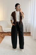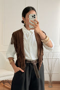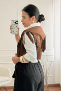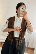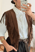 Este colete feminino inspirado no estilo western é uma peça marcante que combina atitude e elegância. Confeccionado em tecido de toque suave, apresenta franjas longas nas laterais e costas que conferem movimento e personalidade ao look.Ideal para quem procura um toque boho ou cowboy chic no guarda-roupa.