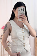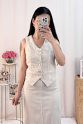 O colete estruturado e a saia fluida criam uma combinação incrível!