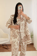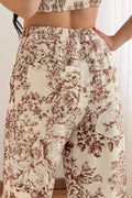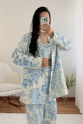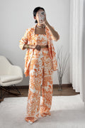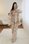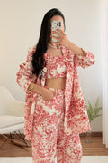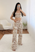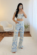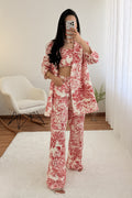 Conjunto de três peças com estampado, composto por top, casaco e calças. O top tem elástico nas costas e a cintura das calças também é elástica – tamanho único, adequado para S, M e L.