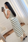 Conjunto de malha com listras clássicas em preto e branco, composto por uma camisola estilo colete e uma saia longa.