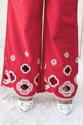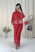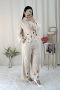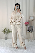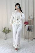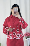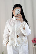 Conjunto de camisa com detalhes de flores em bordado vazado na parte inferior da blusa e das calças.