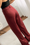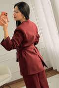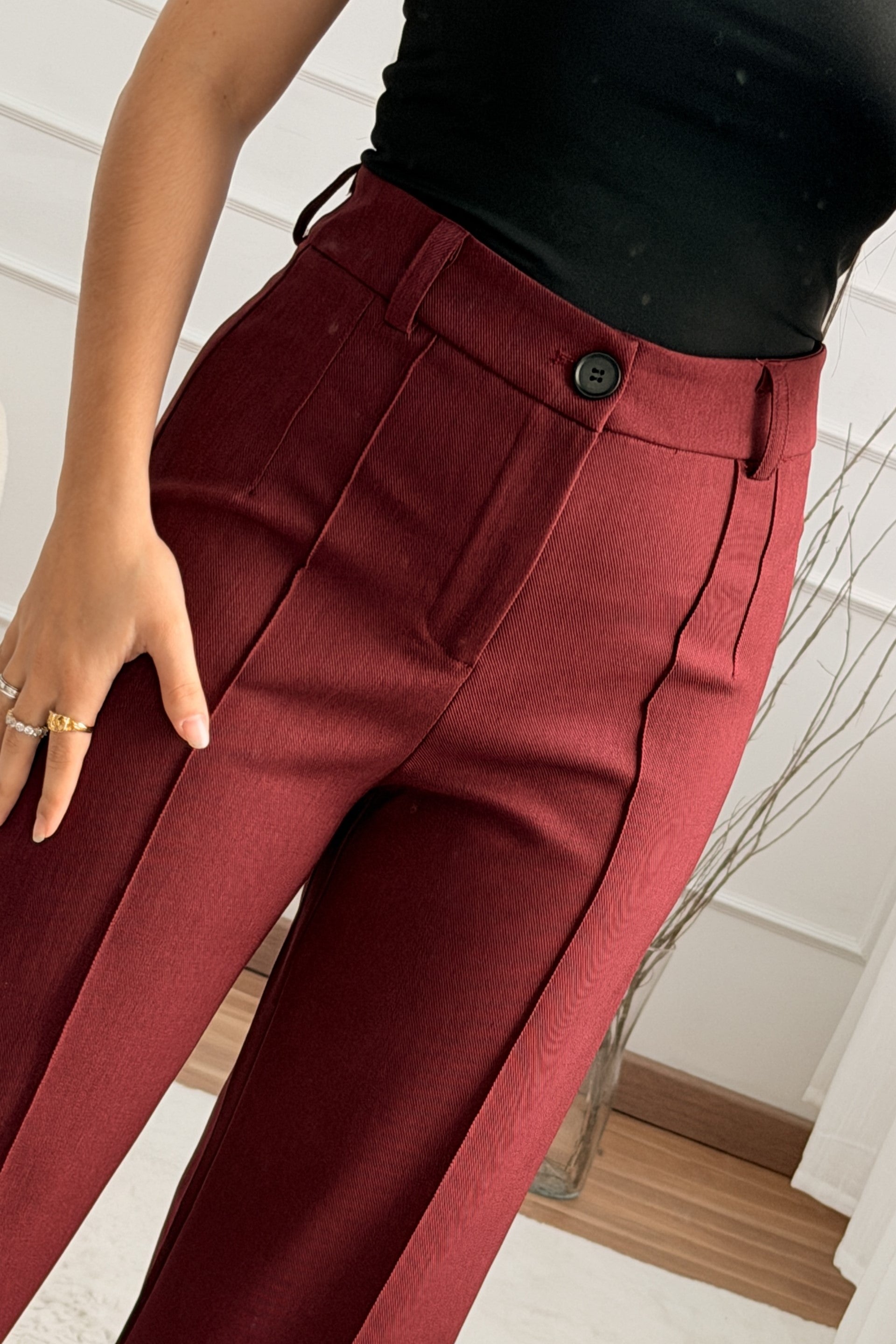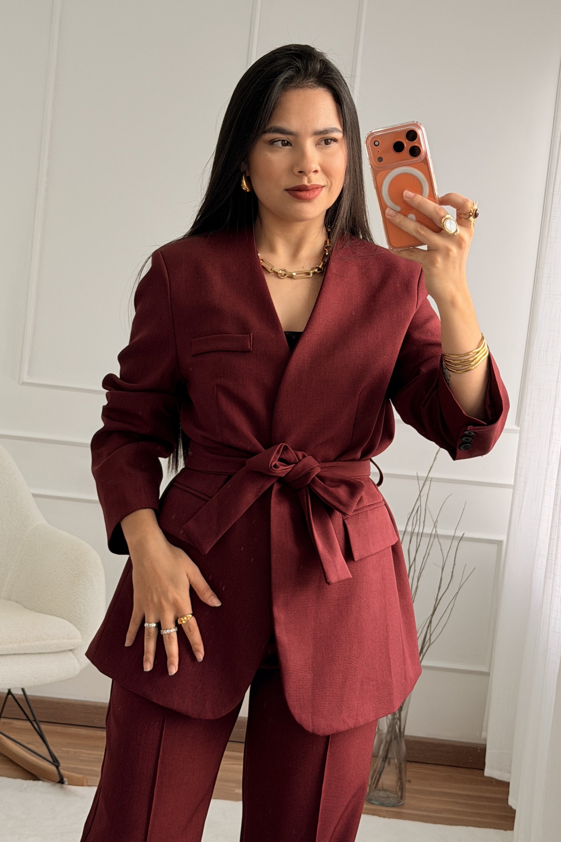 O casaco tem bolsos e cinto, e as calcas com elástico na parte de trás.