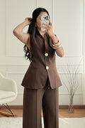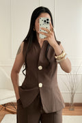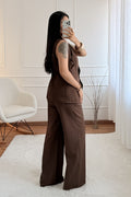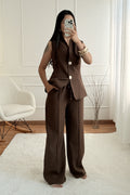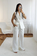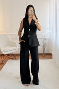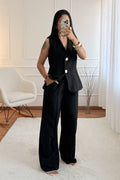 Este conjunto sofisticado combina um colete estruturado sem mangas com calças de corte largo, oferecendo um look elegante e contemporâneo. O colete tem um design ajustado à cintura, valorizado por botões decorativos que adicionam charme ao visual. As calças largas proporcionam conforto e movimento