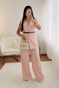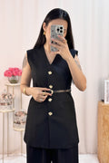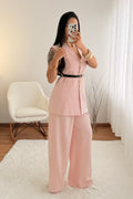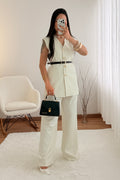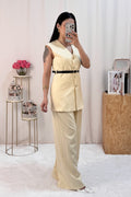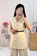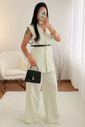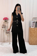 Esta peça do conjunto tem uma blusa sem mangas com uma fila de botões metálicos delicados na parte frontal. Além disso, vem com um cinto, o que adiciona um toque de sofisticação à peça.