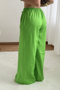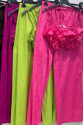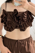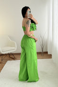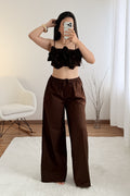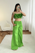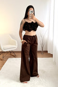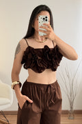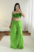 Conjunto leve, moderno e confortável, perfeito para dias quentes ou momentos de lazer. O cropped com alças finas e babados frontais adiciona um toque delicado ao visual, enquanto a calça pantalona com cintura elástica e bolsos laterais garante praticidade e liberdade de movimento. Ideal para férias, passeios e combinações casuais com estilo.