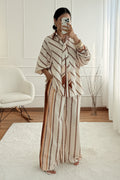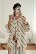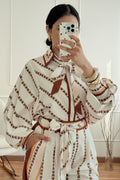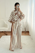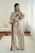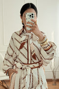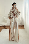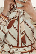 Conjunto elegante em cetim premium, com estampa de corrente sofisticada. A camisa oversized vem com duas fitas em cetim para amarração versátil. As calças palazzo de cintura alta alongam a silhueta e vêm com cinto do mesmo tecido.