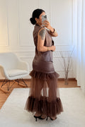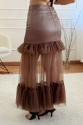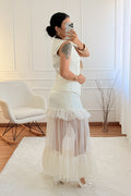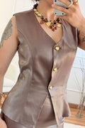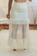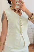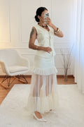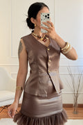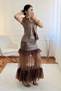 Este conjunto feminino apresenta uma combinação sofisticada de linhas modernas e detalhes delicados. O colete estruturado com botões frontais realça a silhueta, enquanto a saia longa em organza translúcida com acabamento plissado transmite leveza e movimento.