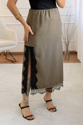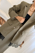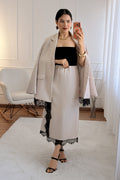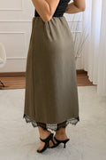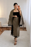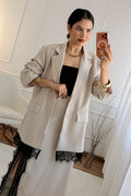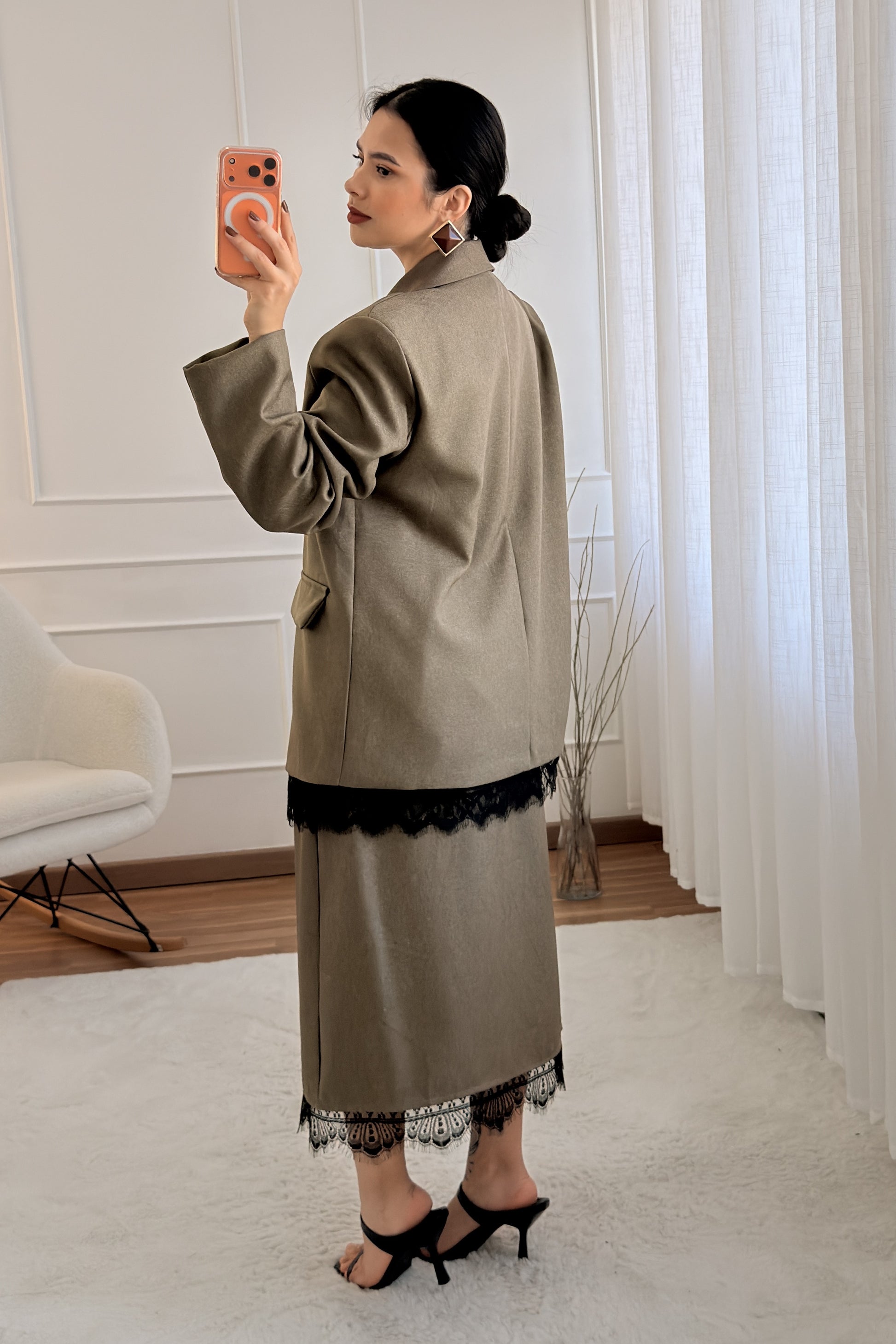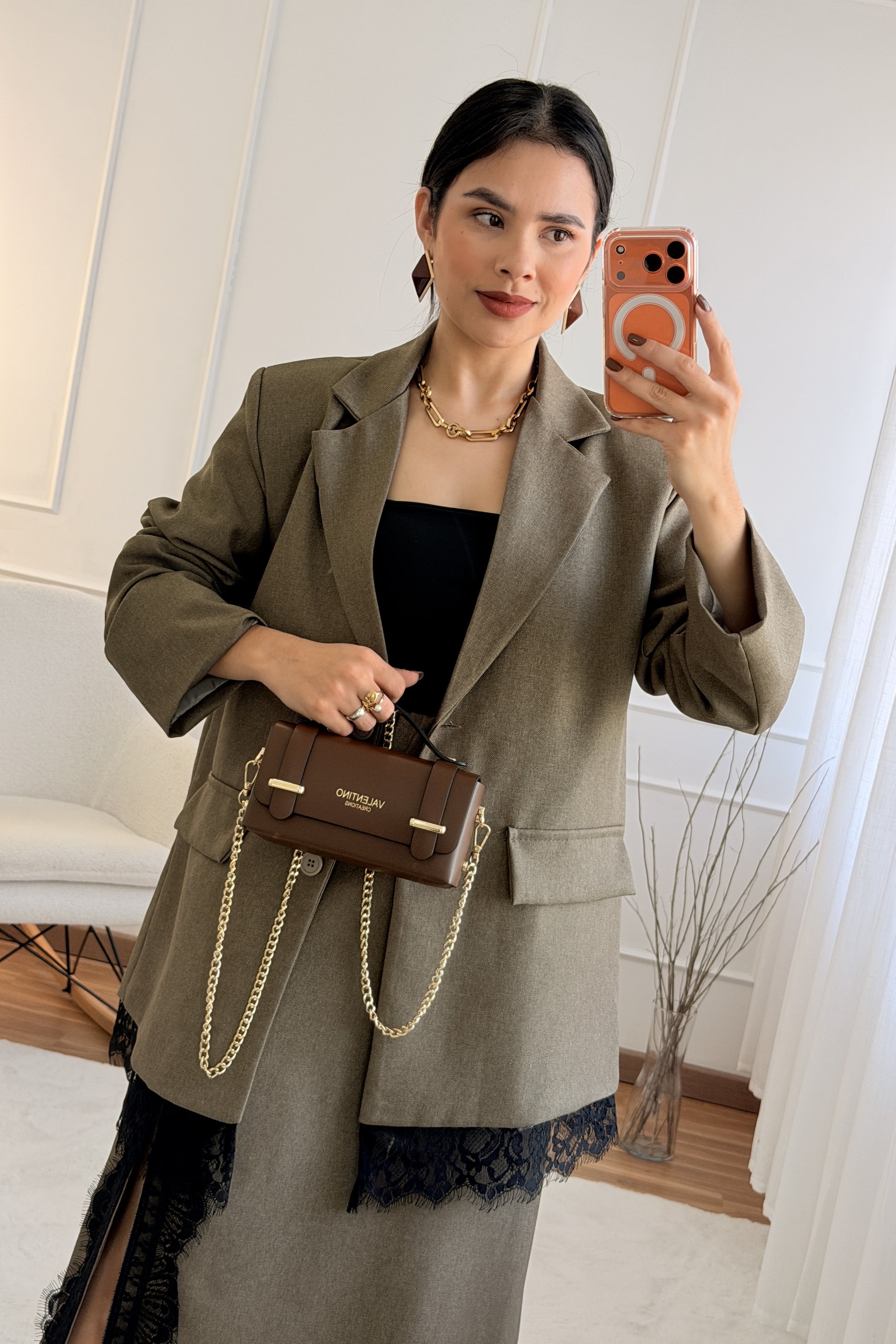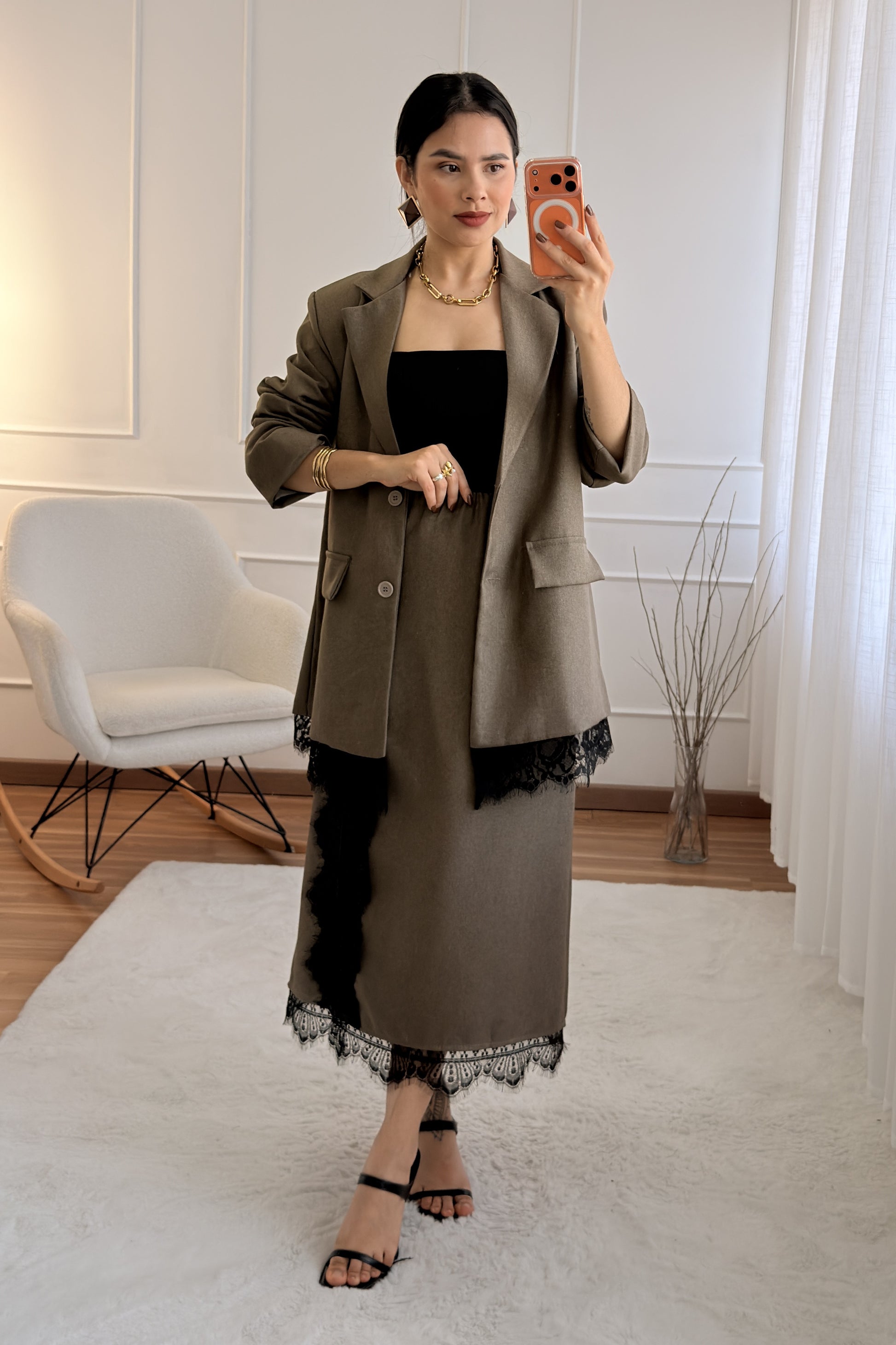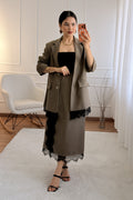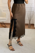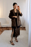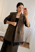Sofisticado e moderno, este conjunto em tom marrom com detalhes em renda é a escolha perfeita para quem busca elegância com um toque contemporâneo. A jaqueta de corte reto traz estrutura e estilo, enquanto a saia com fenda lateral e barra rendada valoriza a silhueta com sutileza e charme.
