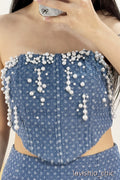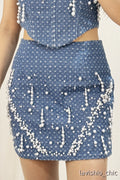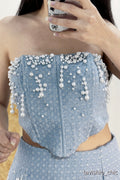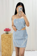 Um conjunto que respira sofisticação e delicadeza! Este look encantador destaca-se pelos detalhes em pérolas aplicadas cuidadosamente, criando um efeito único e super glamoroso. 💎🌸 A combinação do top estruturado com a saia dá aquele toque de elegância perfeita para qualquer ocasião especial.