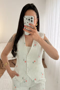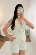 Conjunto colete + calções com textura marcante no tecido e estampado floral fresco que evoca os dias leves de verão. Um look elegante e descontraído com um toque natural.