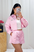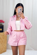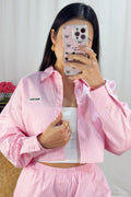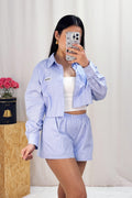 Conjunto de riscas, com uma camisa curta na parte superior e calções com elástico na cintura. A peça combina um estilo casual e confortável,