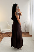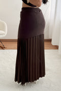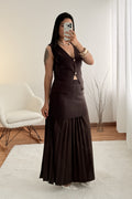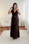 Conjunto feminino em malha canelada, composto por colete sem mangas e saia plissada comprida. O tecido de malha oferece conforto e flexibilidade, enquanto o design estruturado mantém um visual elegante e moderno. O colete ajusta-se suavemente ao corpo, e a saia com pregas confere movimento e sofisticação.