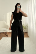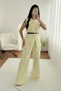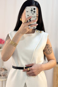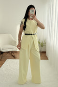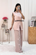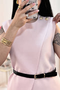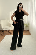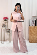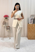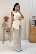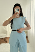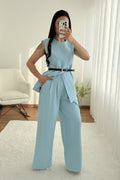 O conjunto apresenta uma blusa sem mangas com o fecho cruzado na parte frontal. De um lado, há dois botões justos no ombro, adicionando um toque elegante à peça.