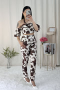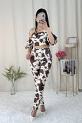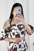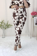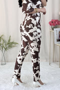 Conjunto com padrão de animal print. A parte superior é um top de corte curto, com decote strapless e ombros à mostra. A parte inferior tem calças de cintura alta e corte justo.