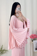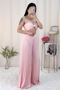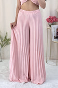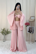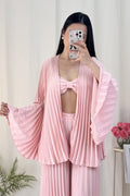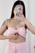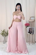 Conjunto Plissado🥰🤩 um look fluido, confortável e super estiloso! 💙 Conjunto de 3 peças com alça de pérola removível, mangas boca de sino e calças largas – perfeito para qualquer ocasião!
