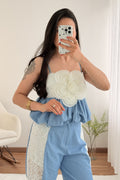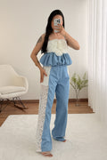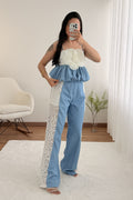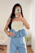Conjunto com top de alças ajustáveis, flor na frente e calças largas com renda e tecido de jeans nas laterais.