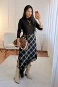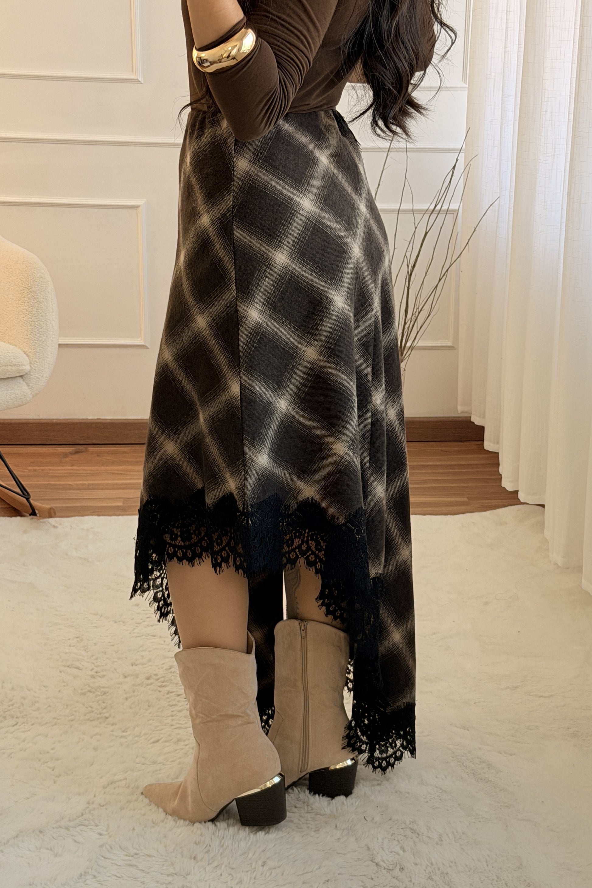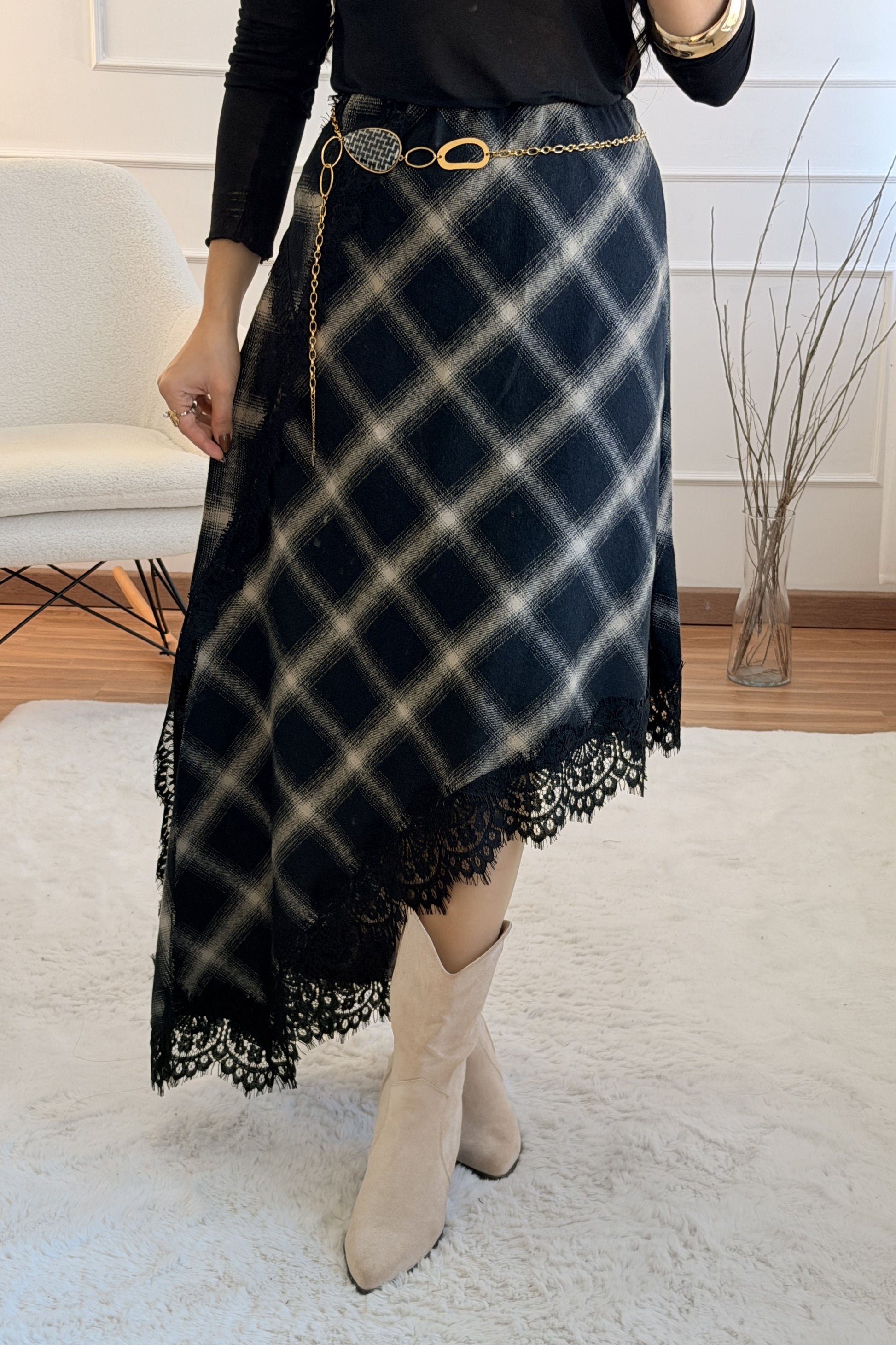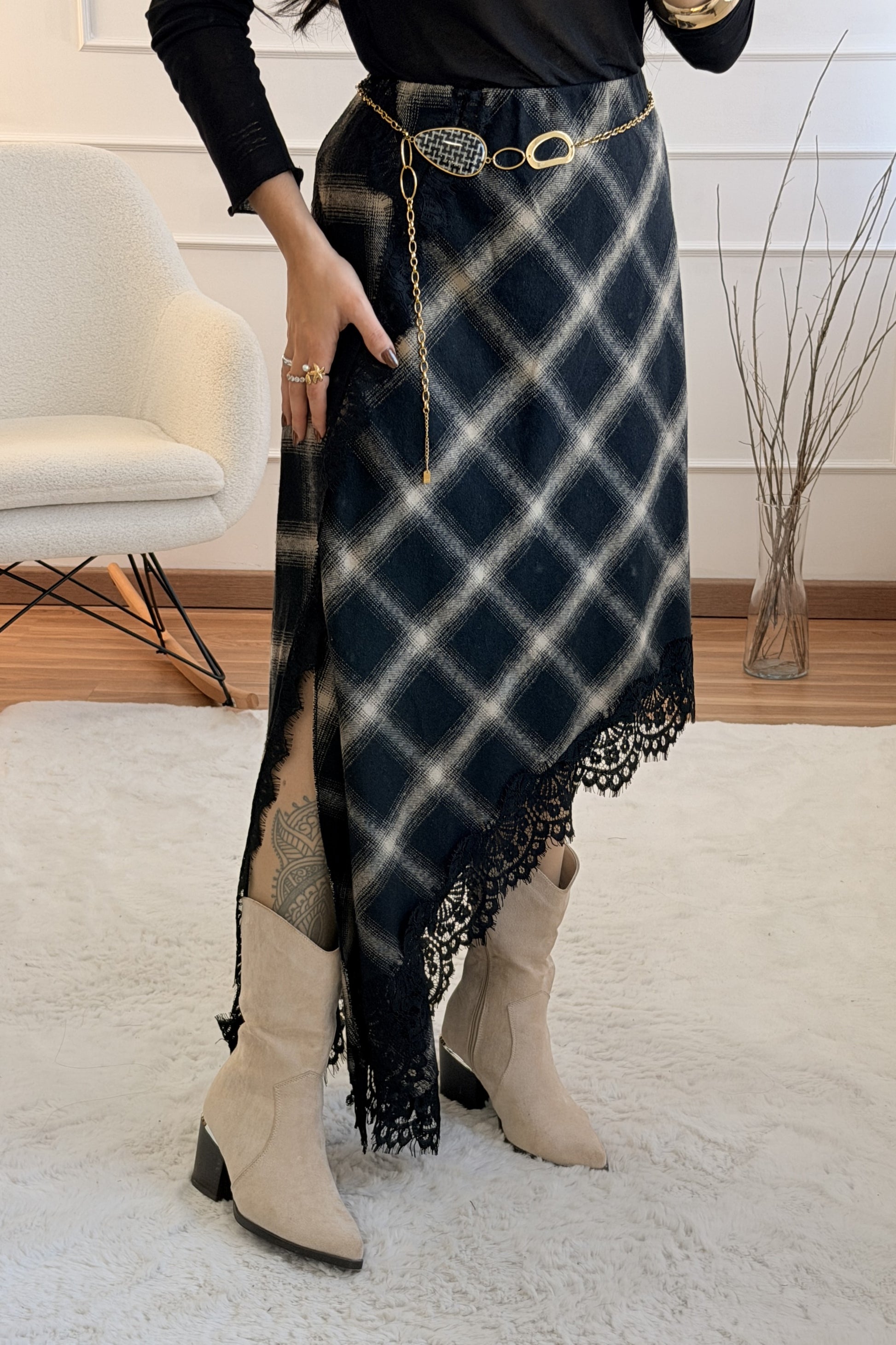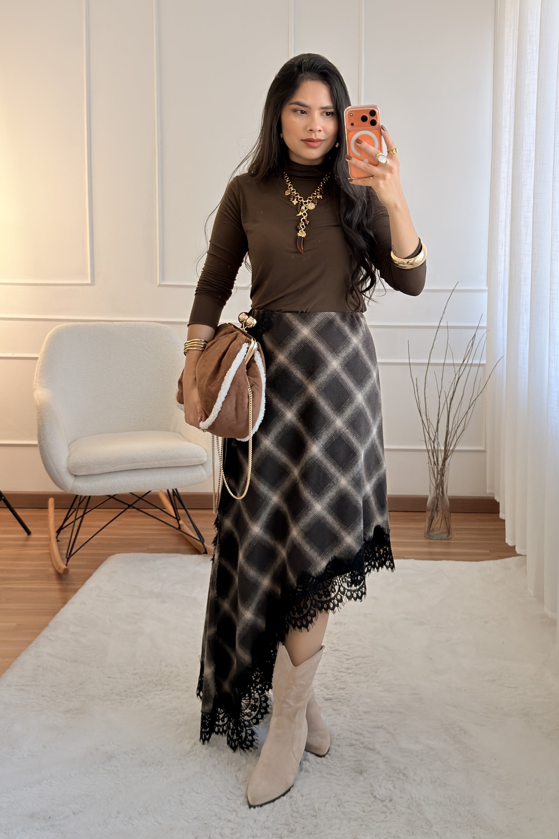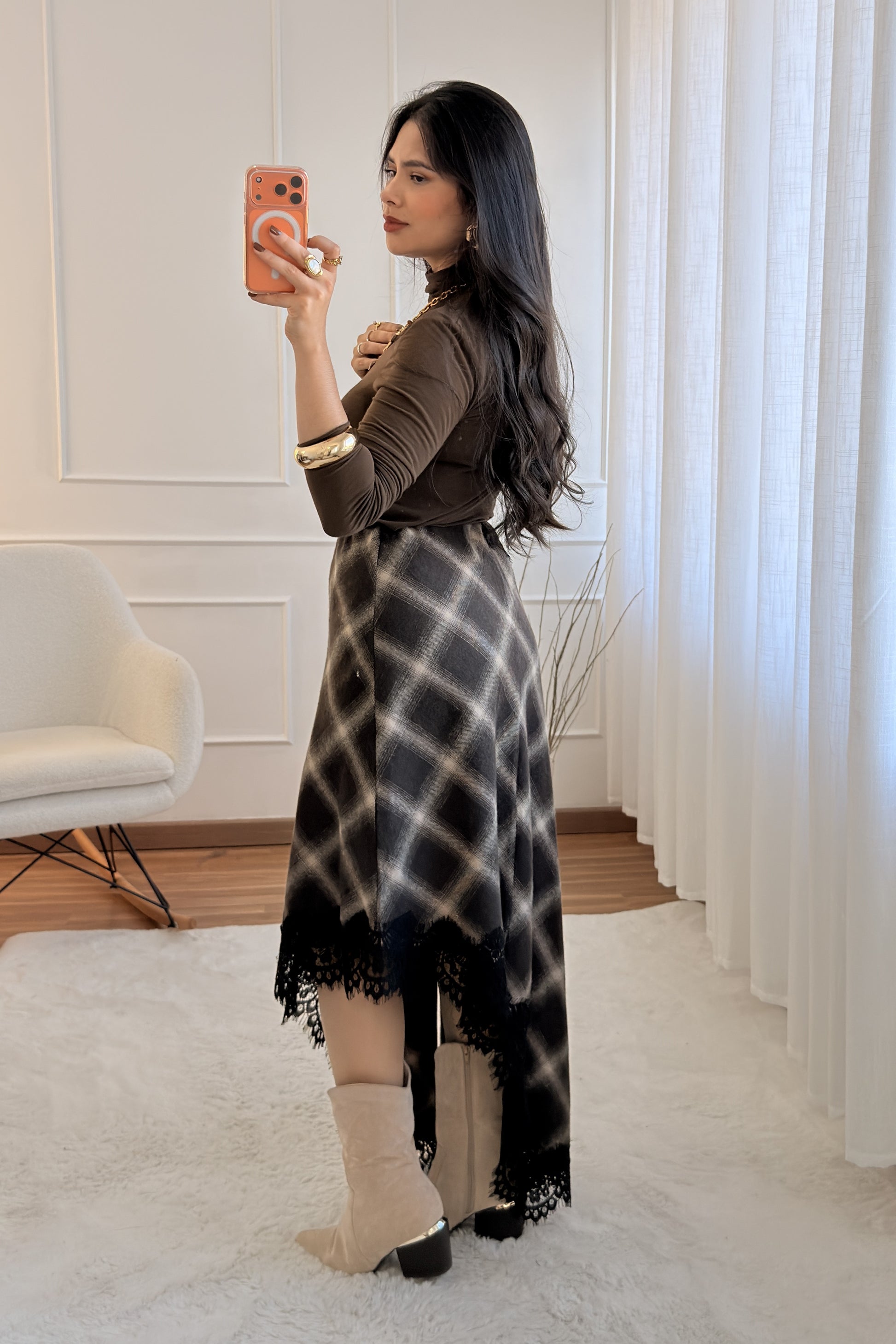Características: corte assimétrico / padrão xadrez / detalhe em renda / cintura elástica