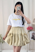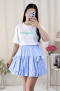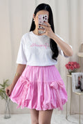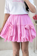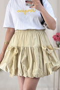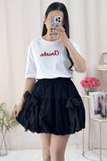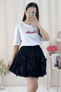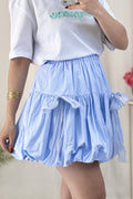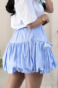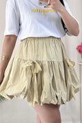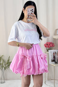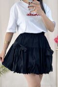 Saia curta em formato de balão com laço de renda, doce e fofa.