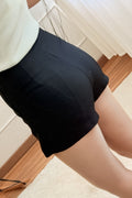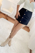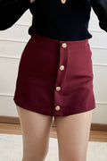 Saia-calção de cintura subida, com botões decorativos dourados na frente. Combina a elegância da saia com o conforto do calção, ideal para looks modernos e versáteis.
