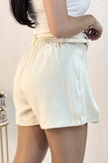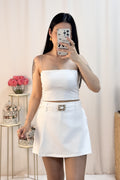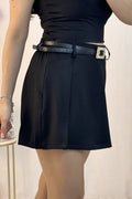 A saia-calção vem acompanhada de um cinto de couro delicado, que adiciona um toque de sofisticação à peça.