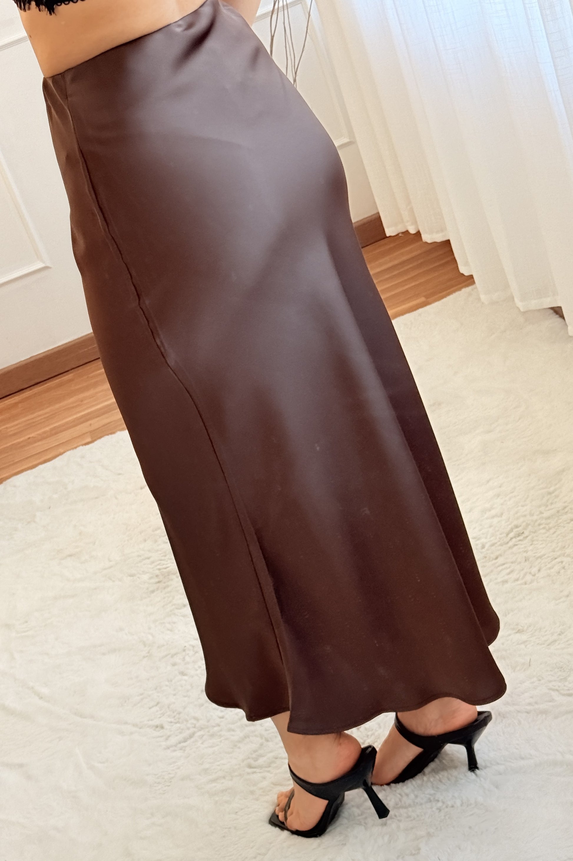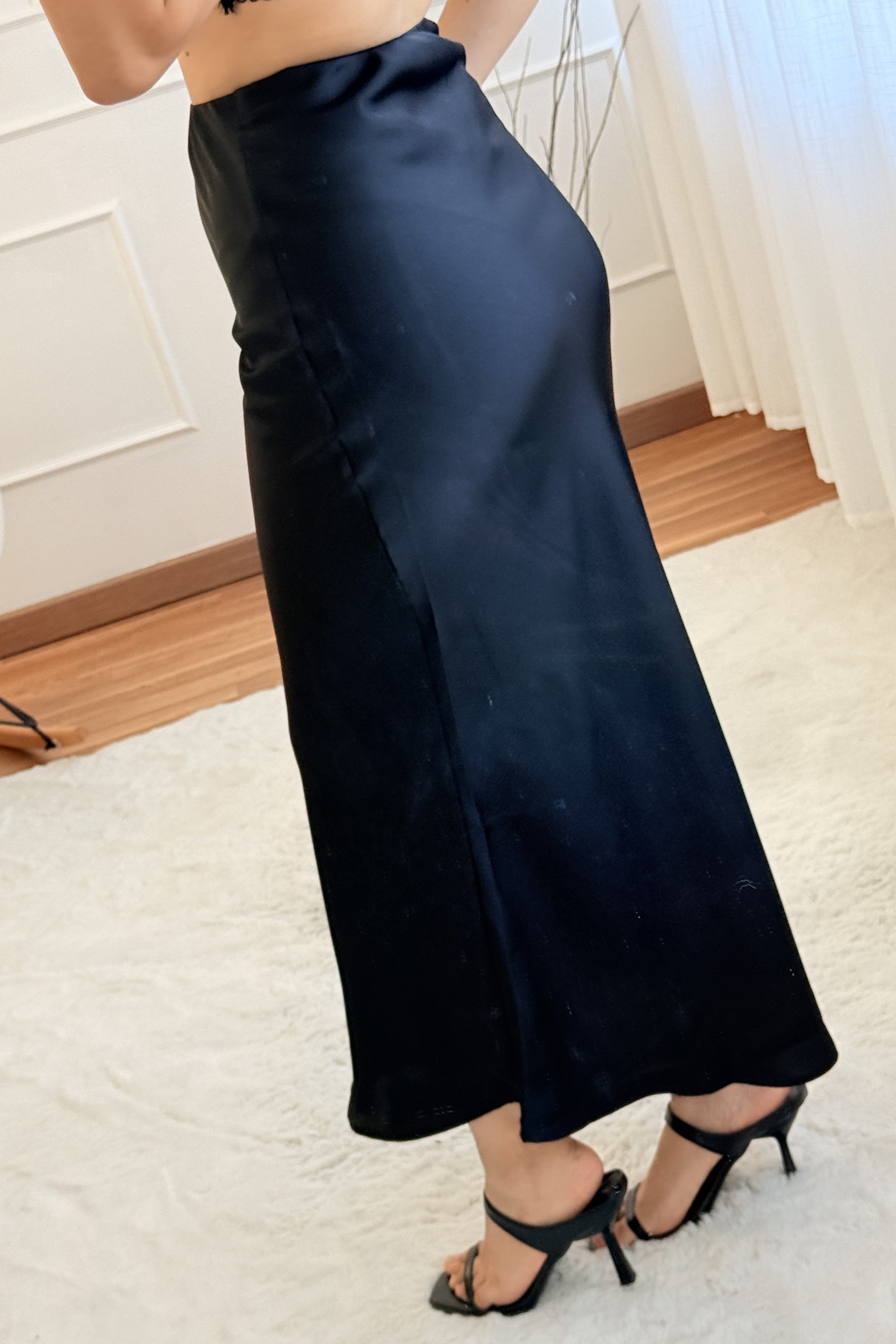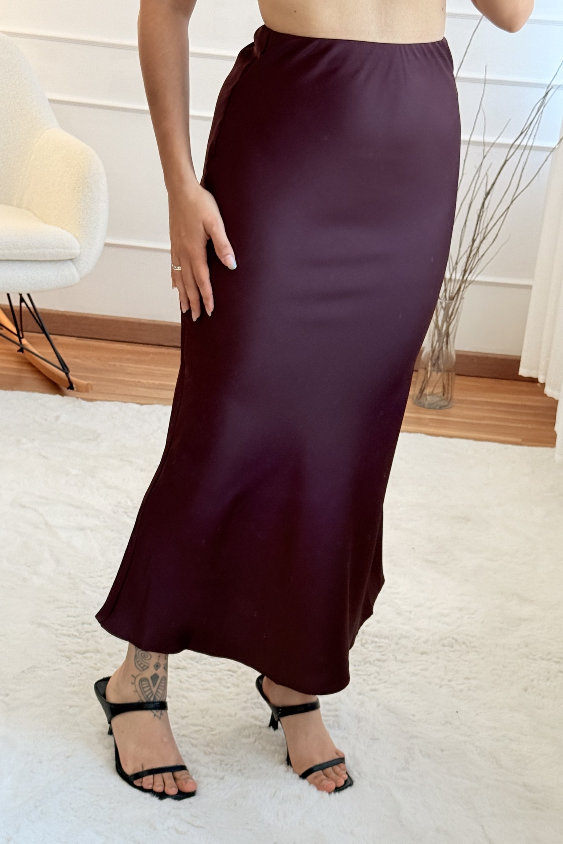 Saia comprida em cetim, de corte elegante, com tecido confortável e cintura elástica de boa adaptação.