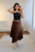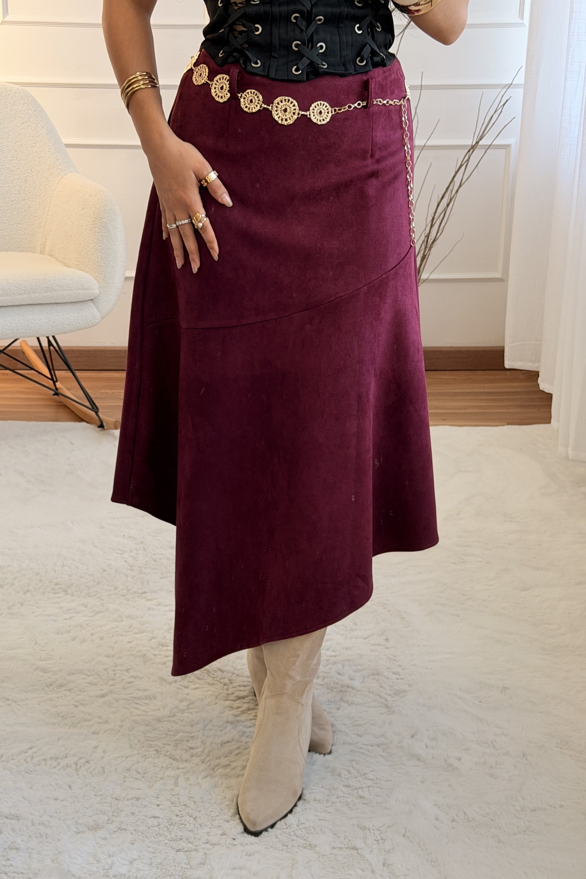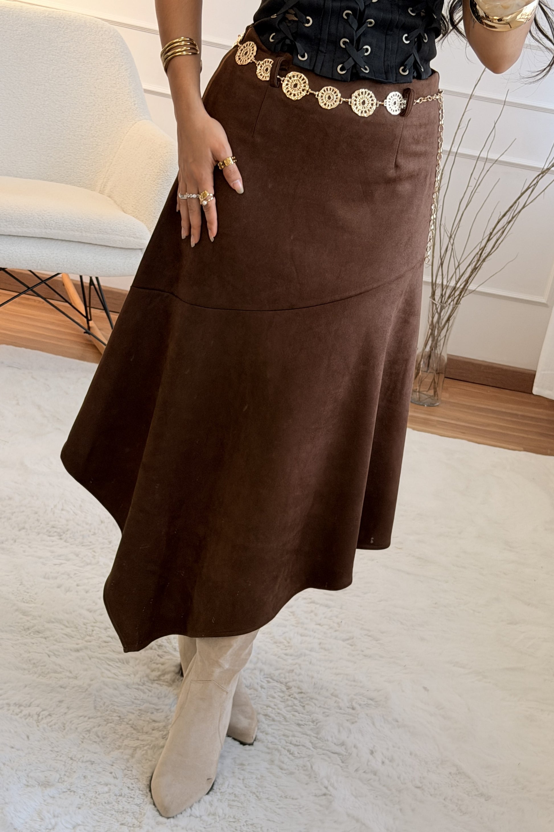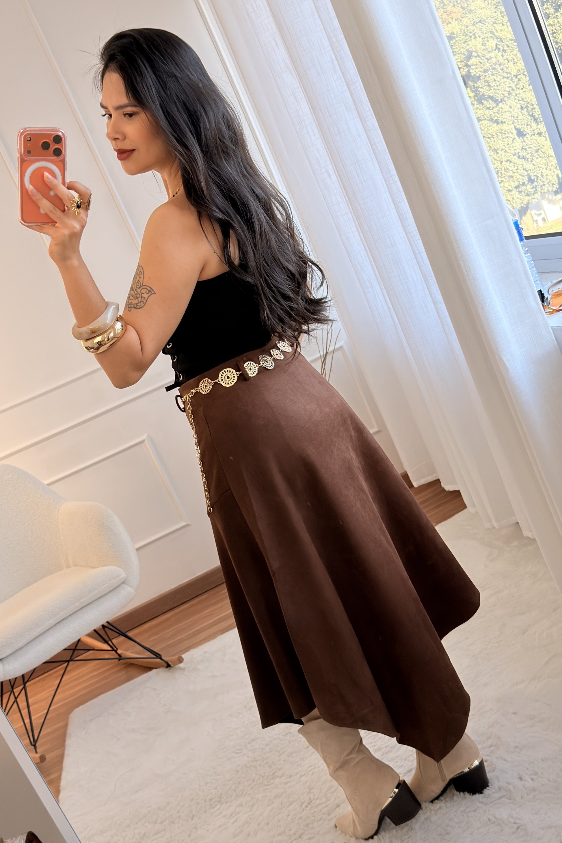 Saia em camurça com corte assimétrico e detalhe moderno. Inclui um cinto de corrente dourada removível, que acrescenta um toque sofisticado e elegante ao visual.
