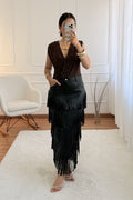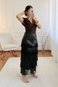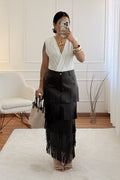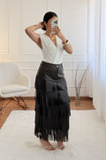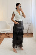 Uma peça que rouba a cena. Esta saia longa com efeito pele destaca-se pelas franjas em camadas que criam movimento e atitude a cada passo. O corte em "V" na parte superior valoriza a silhueta, enquanto o fecho de botão e bolsos funcionais garantem praticidade