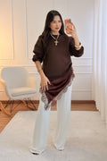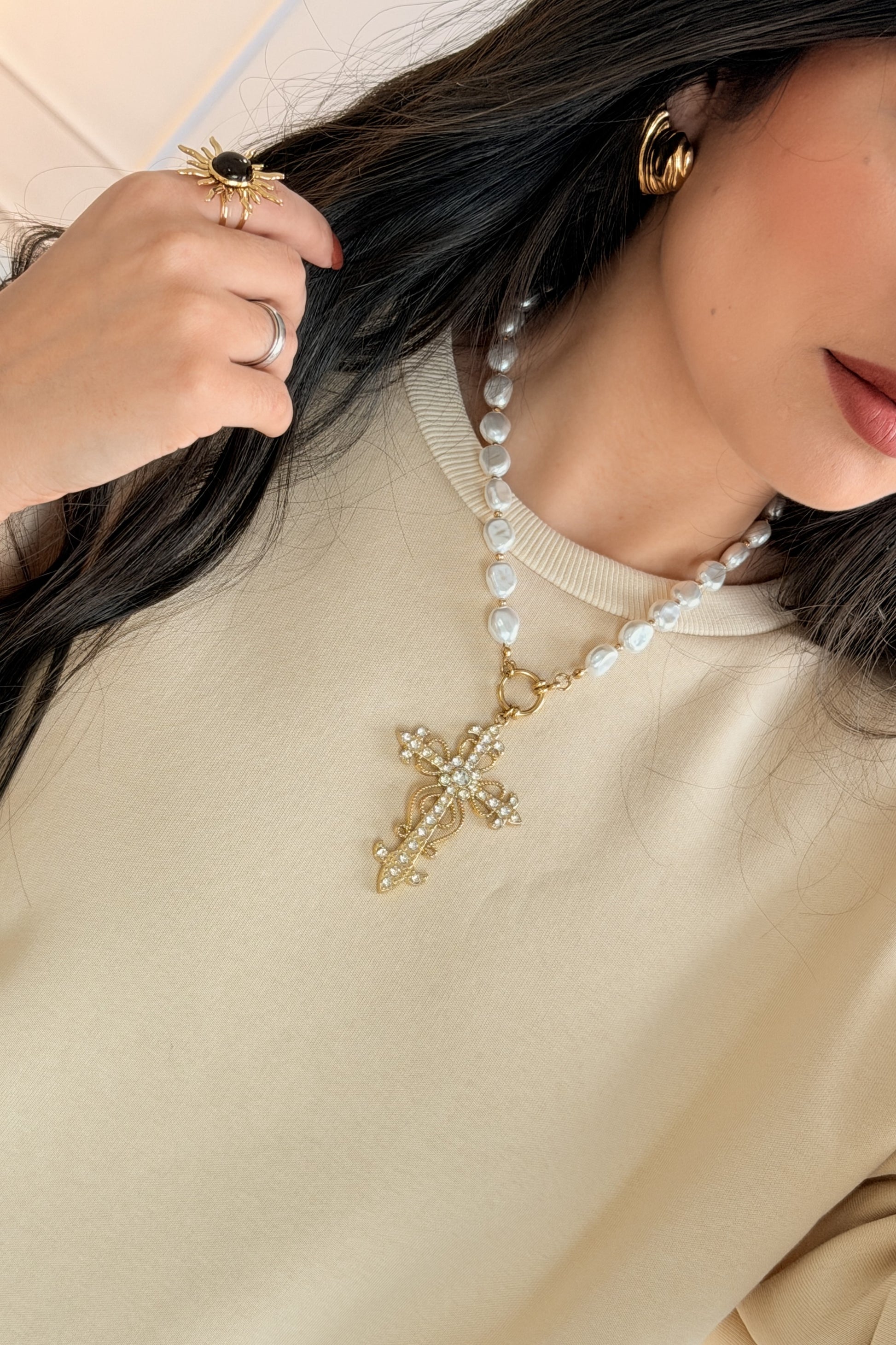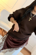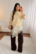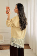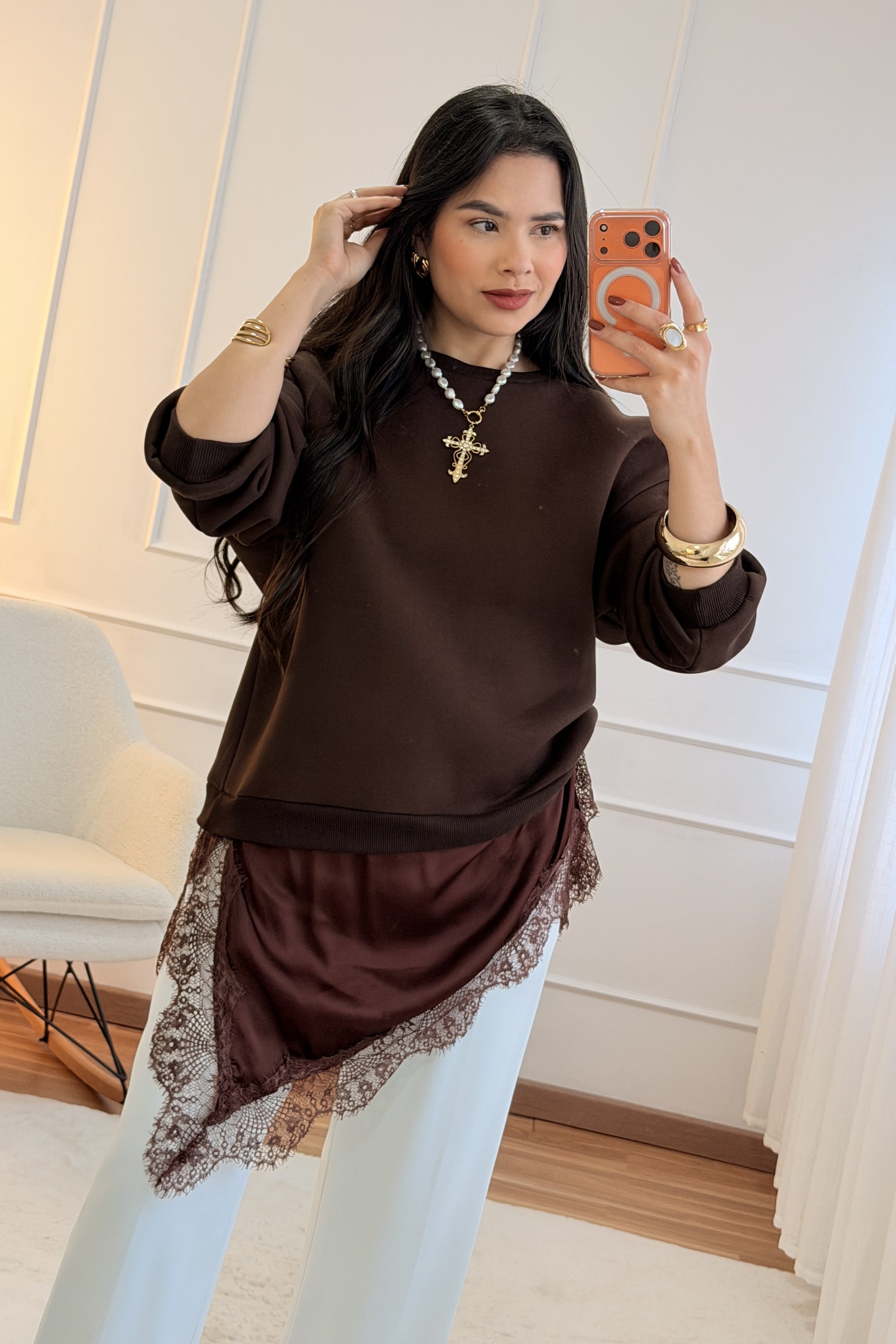 Sweat combinada em algodão misto. Gola redonda e ombros suaves. Tecido duplo assimétrico acetinado. Barra acabada em renda. Interior felpudo. Ajuste oversize,