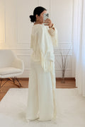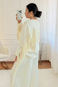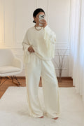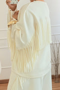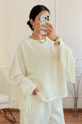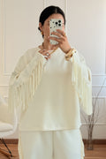 Sweet oversized com franjas aplicadas nas mangas e ao longo das costas, criando um efeito visual dinâmico e marcante. O corte descontraído une conforto e atitude, ideal para visuais modernos com um toque boho ou western sofisticado.