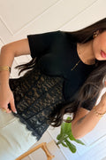 - Detalhe de corset em renda floral na parte frontal e traseira