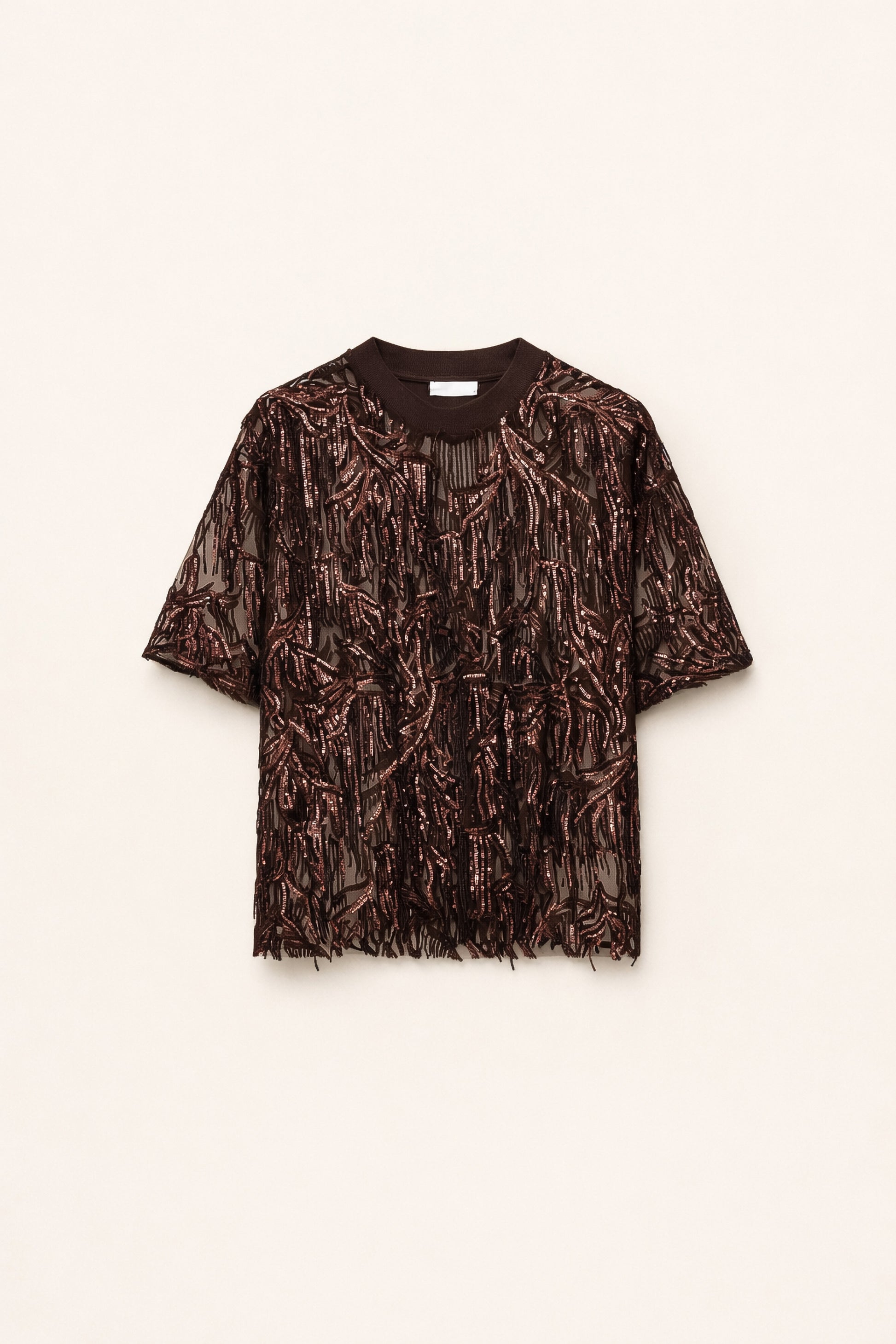 Tecido transparente com aplicações de lantejoulas por todo o corpo e acabamentos pendentes.