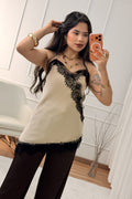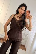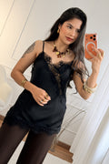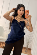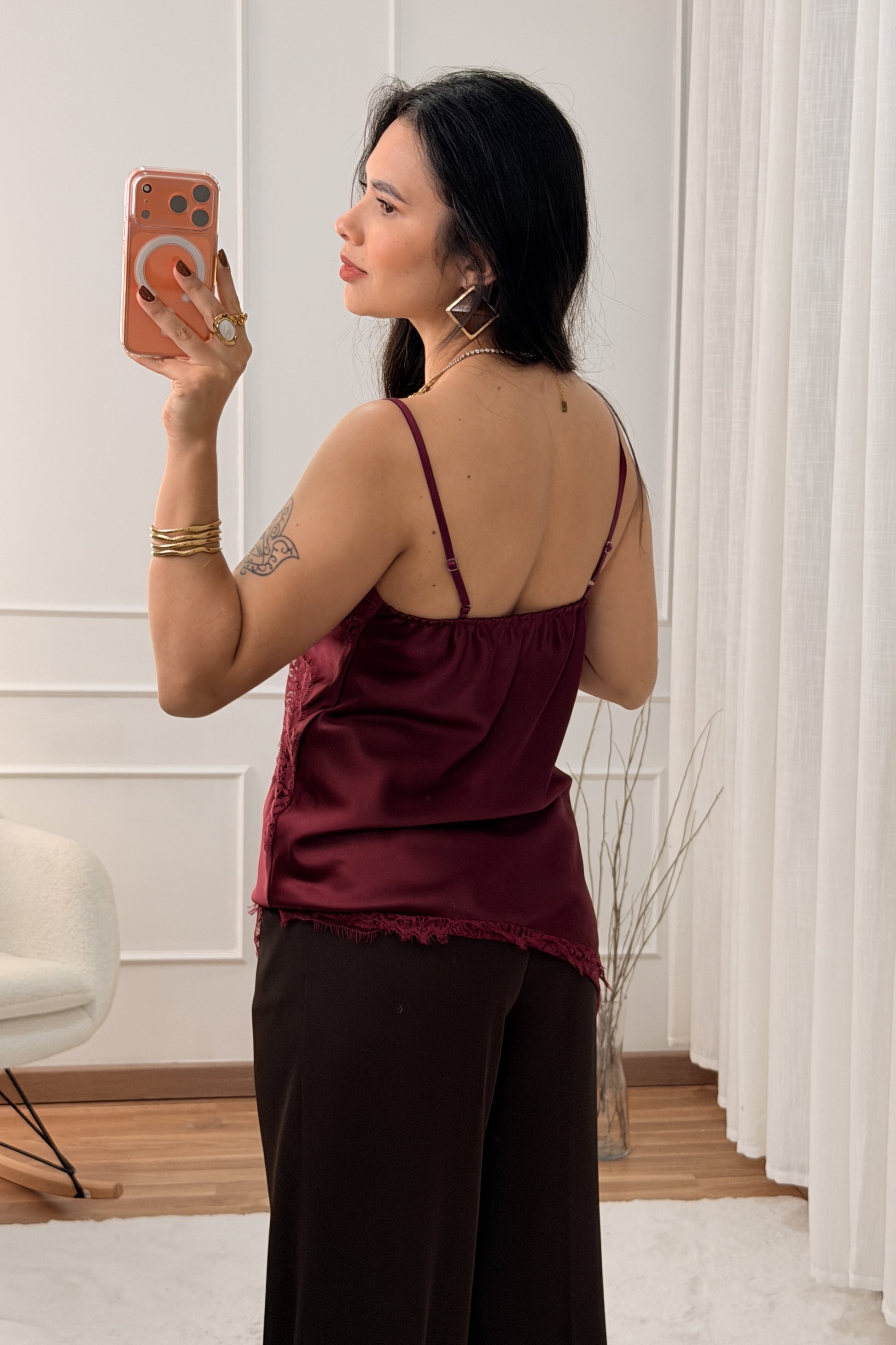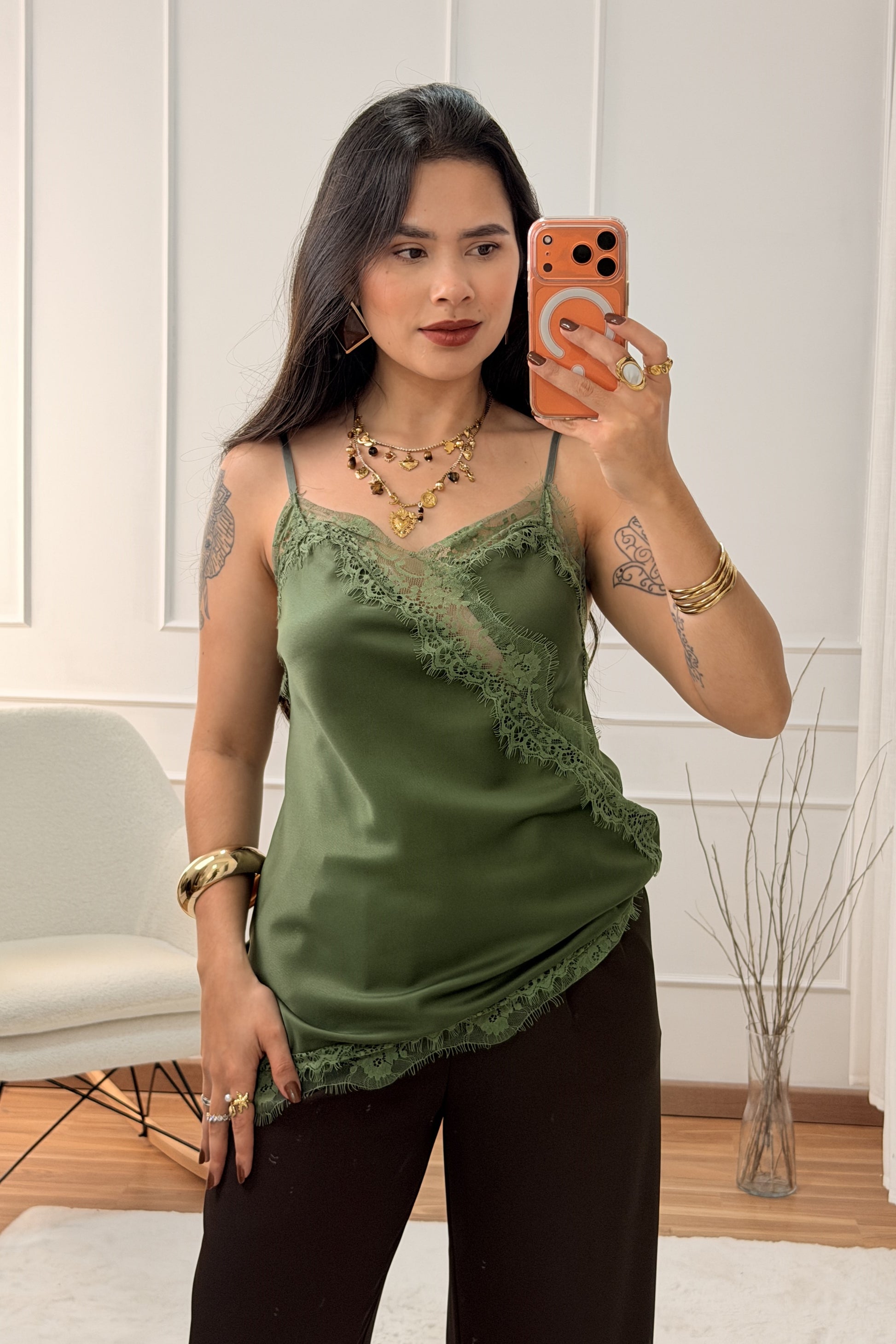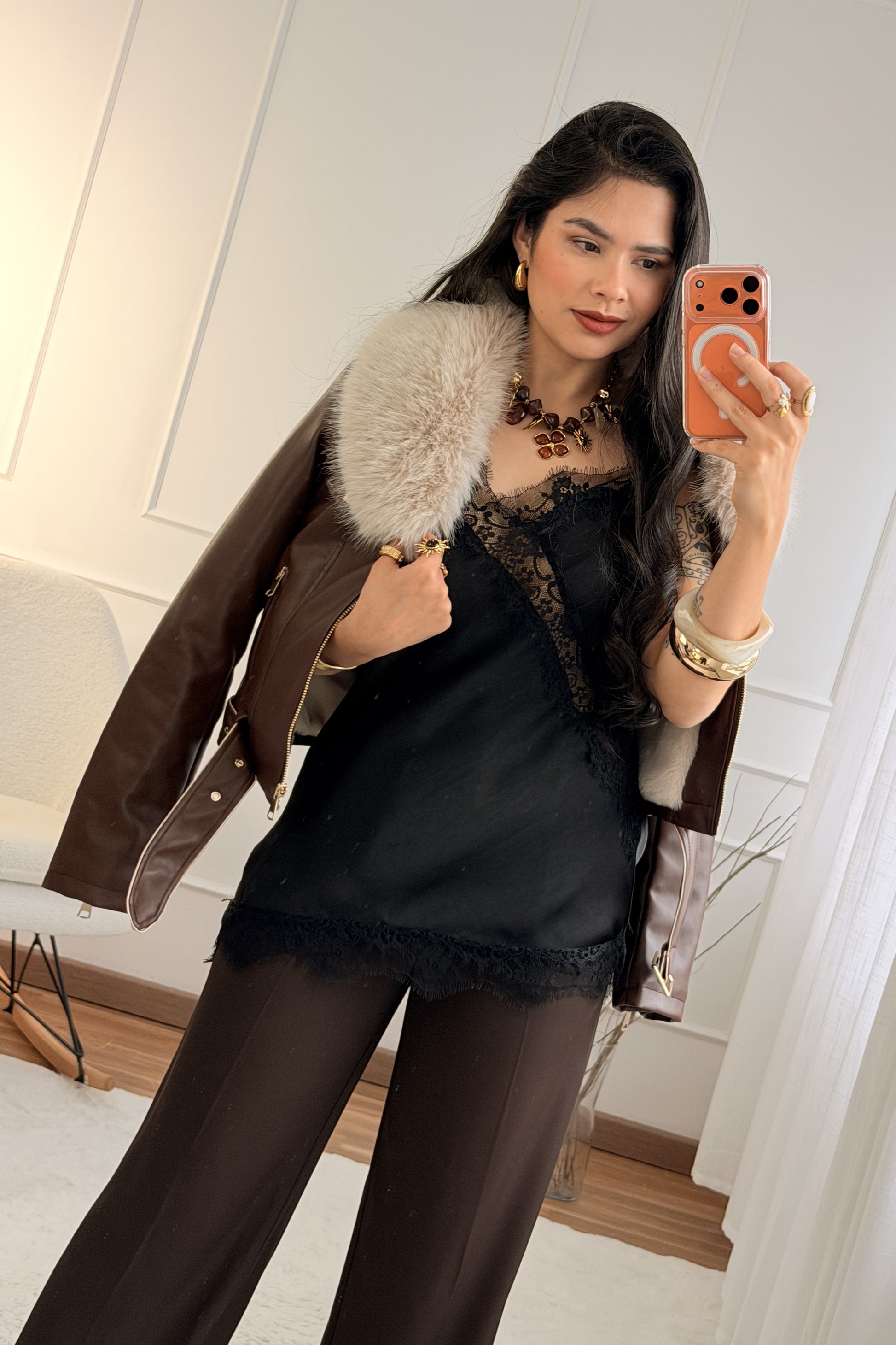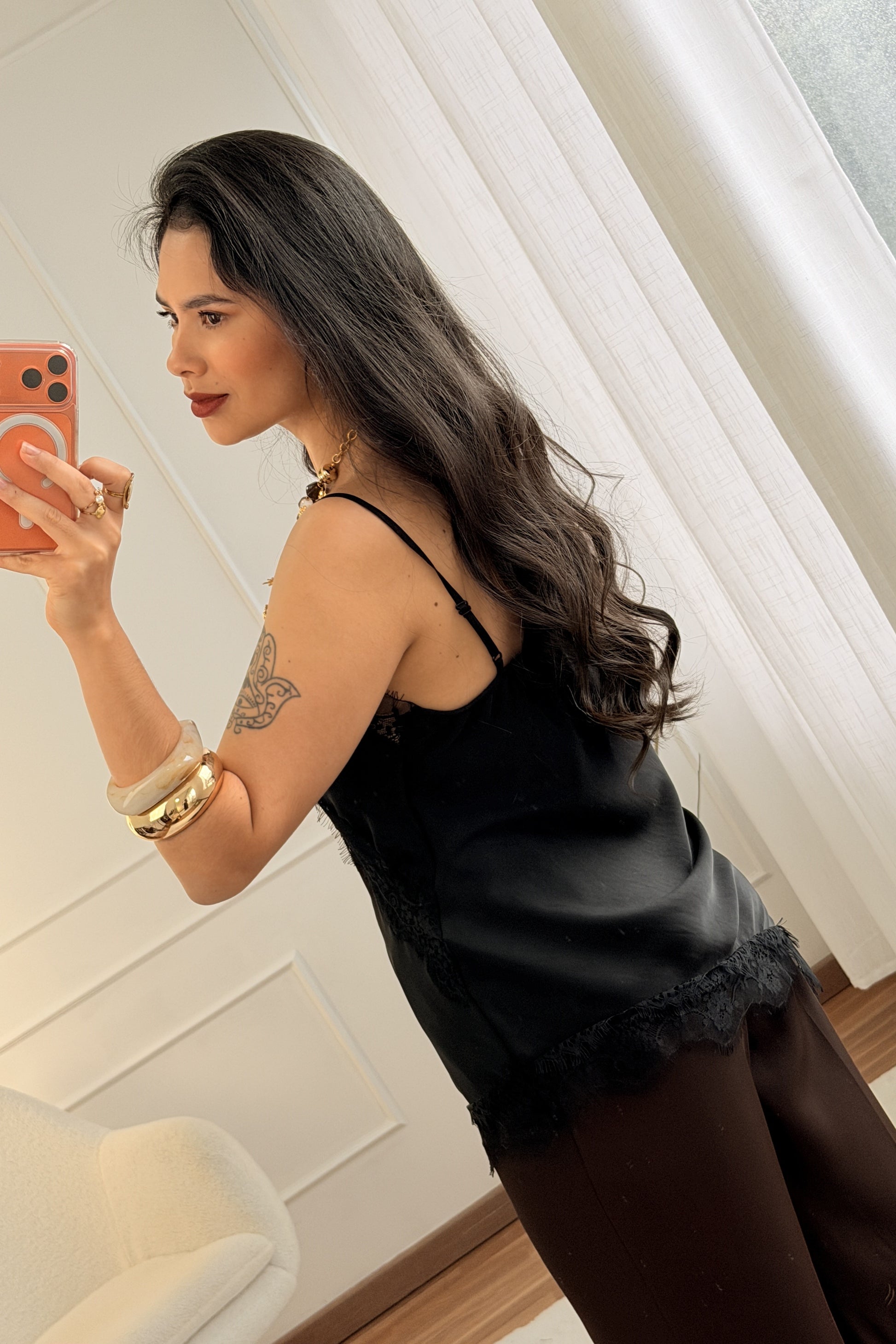 Design assimétrico com detalhe elegante em renda, garantindo um look moderno e sofisticado.