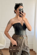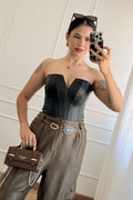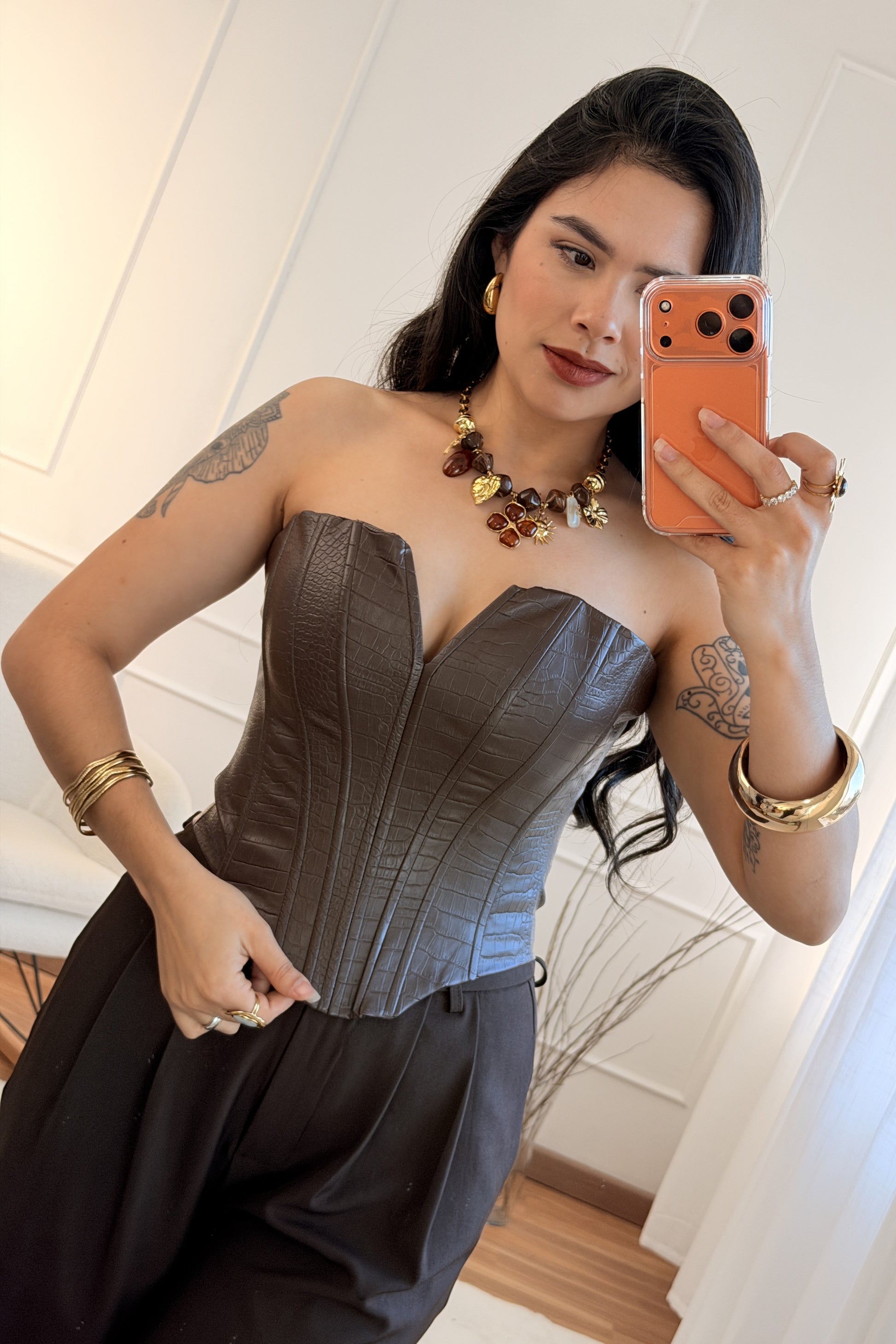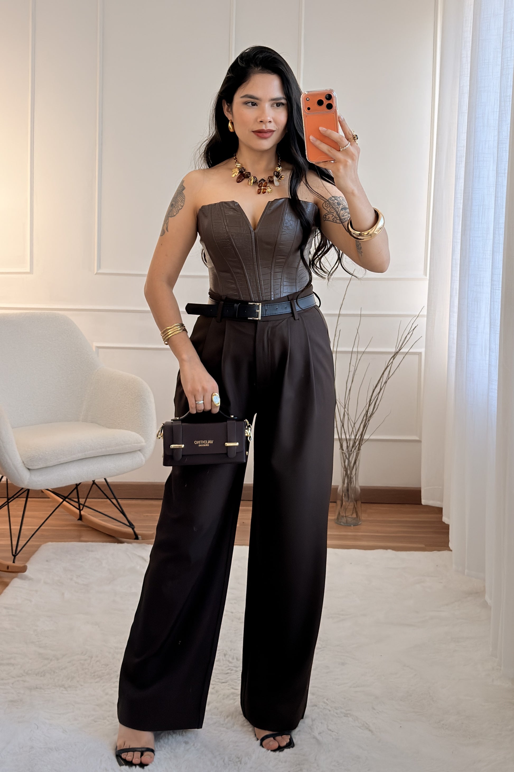 Top estruturado em napa, com decote em V profundo e detalhe posterior em laço ajustável, que garante melhor adaptação ao corpo.